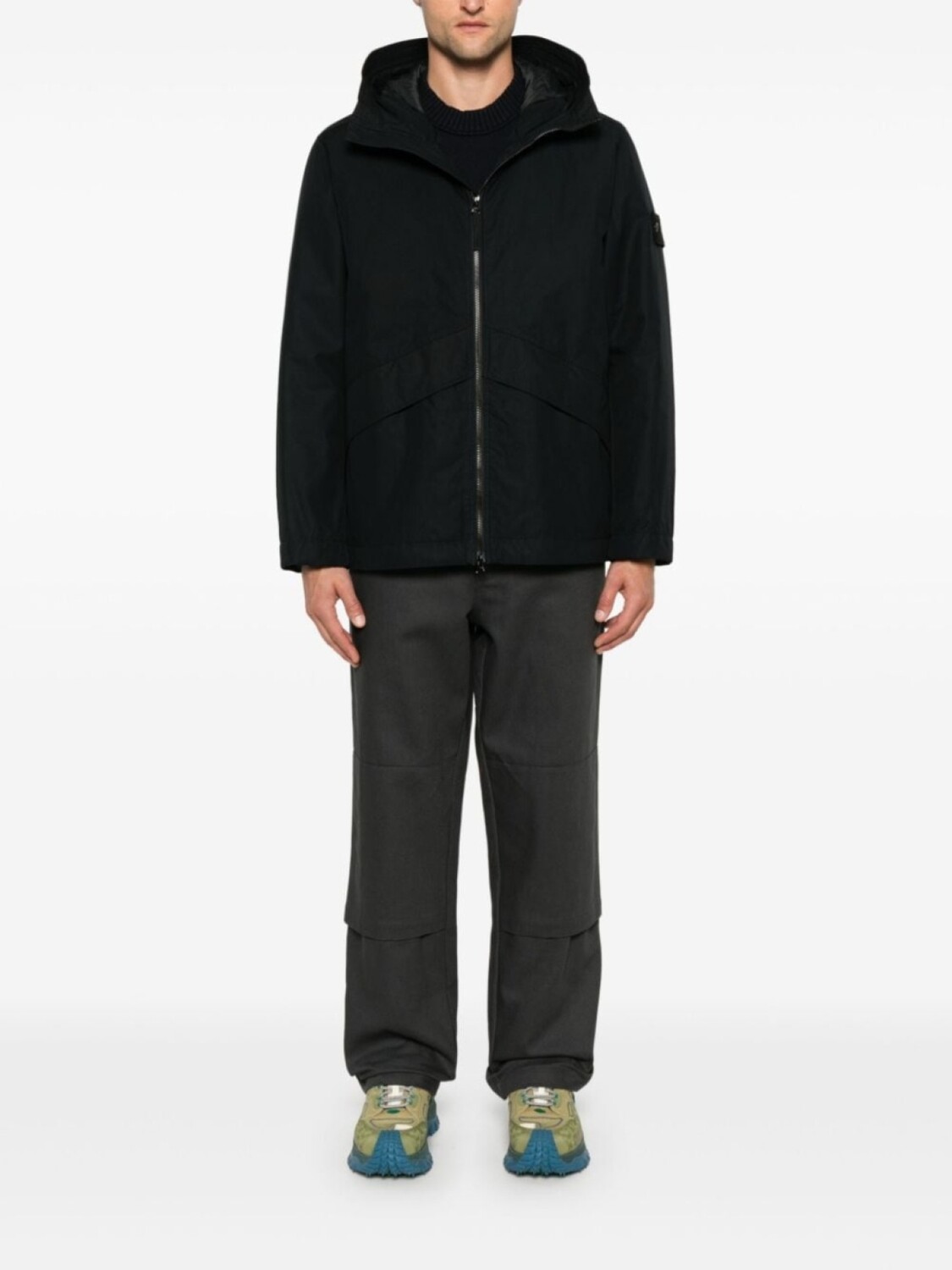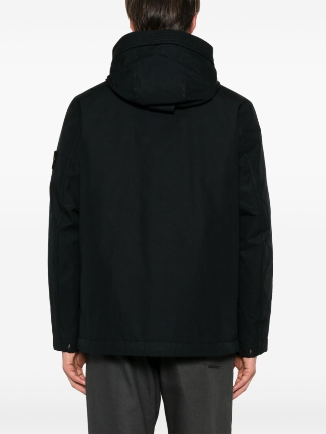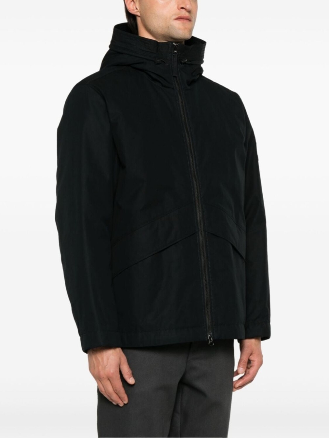 Черный, хлопок, канвас, ветронепроницаемый материал, водоотталкивающий материал, застежка на молнии спереди, затягивающийся на шнурок капюшон, воротник-труба, длинные рукава, съемный значок Compass, манжеты с застежкой на кнопки, два кармана на молнии по бокам, стеганая подкладка, подол с кулиской