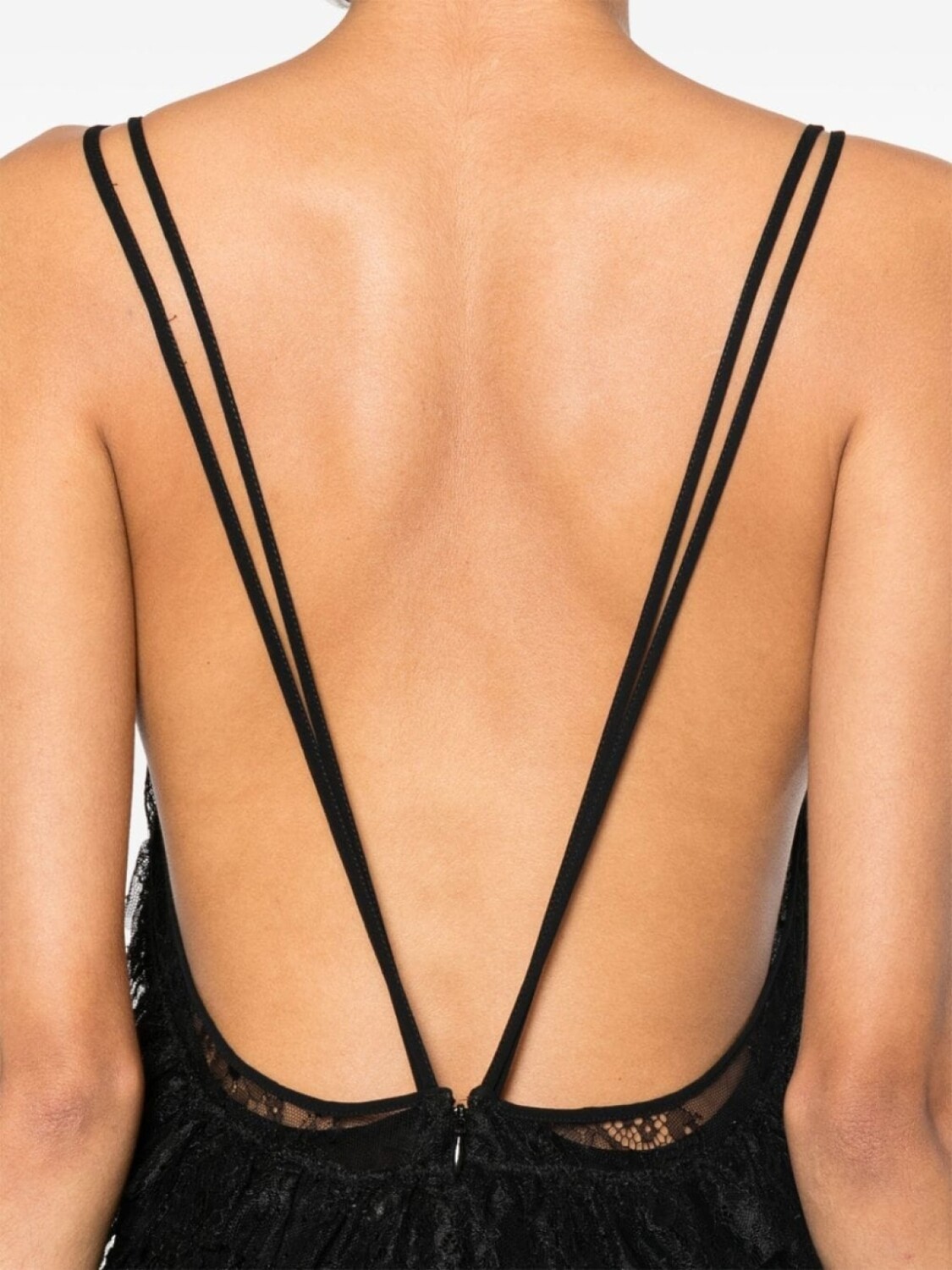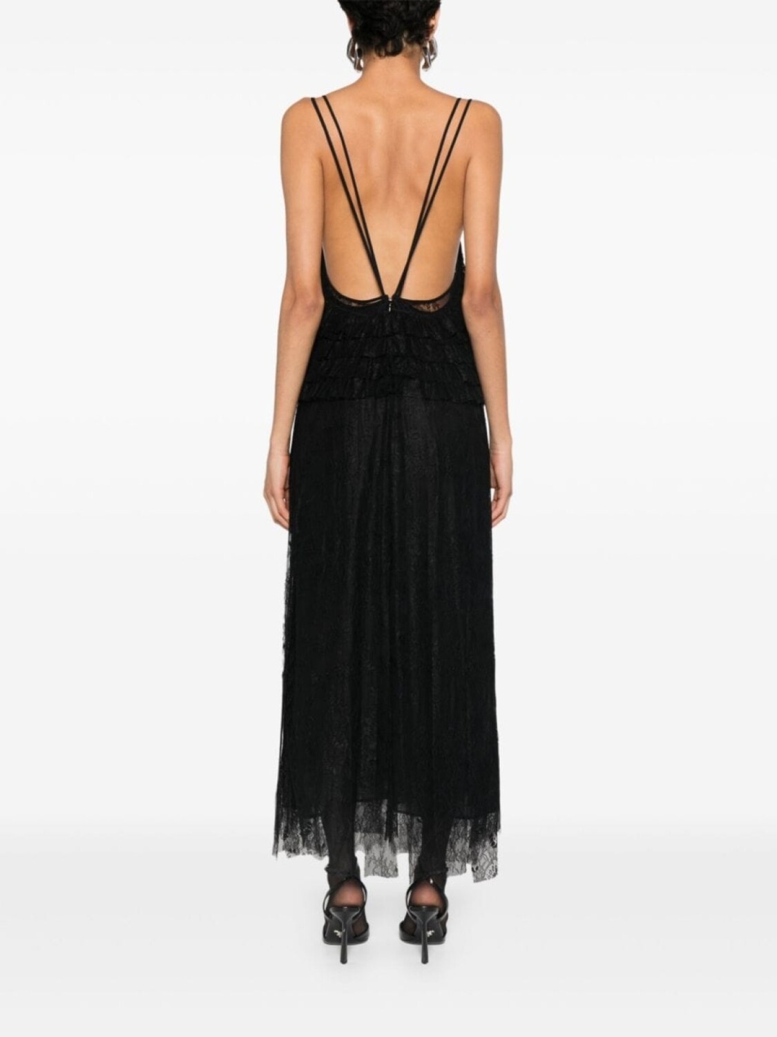 Черный, кружевная деталь, V-образный вырез, без рукавов, вставки с оборками, драпировка, перекрестные бретели на спине, подол с фкстонами, внутреннее платье-комбинация, потайная застежка на молнии сзади