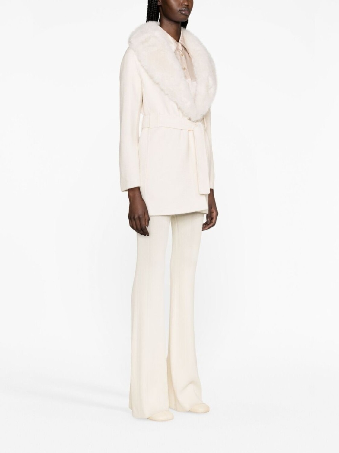 Белый, воротник из искусственного меха, съемный пояс, длинные рукава и два прорезных кармана по бокам.