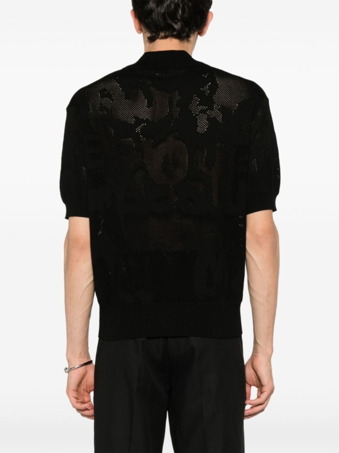 Черный, хлопок, ажурная вязка, воротник поло, короткие рукава, планка на пуговицах спереди, подол и манжеты в рубчик