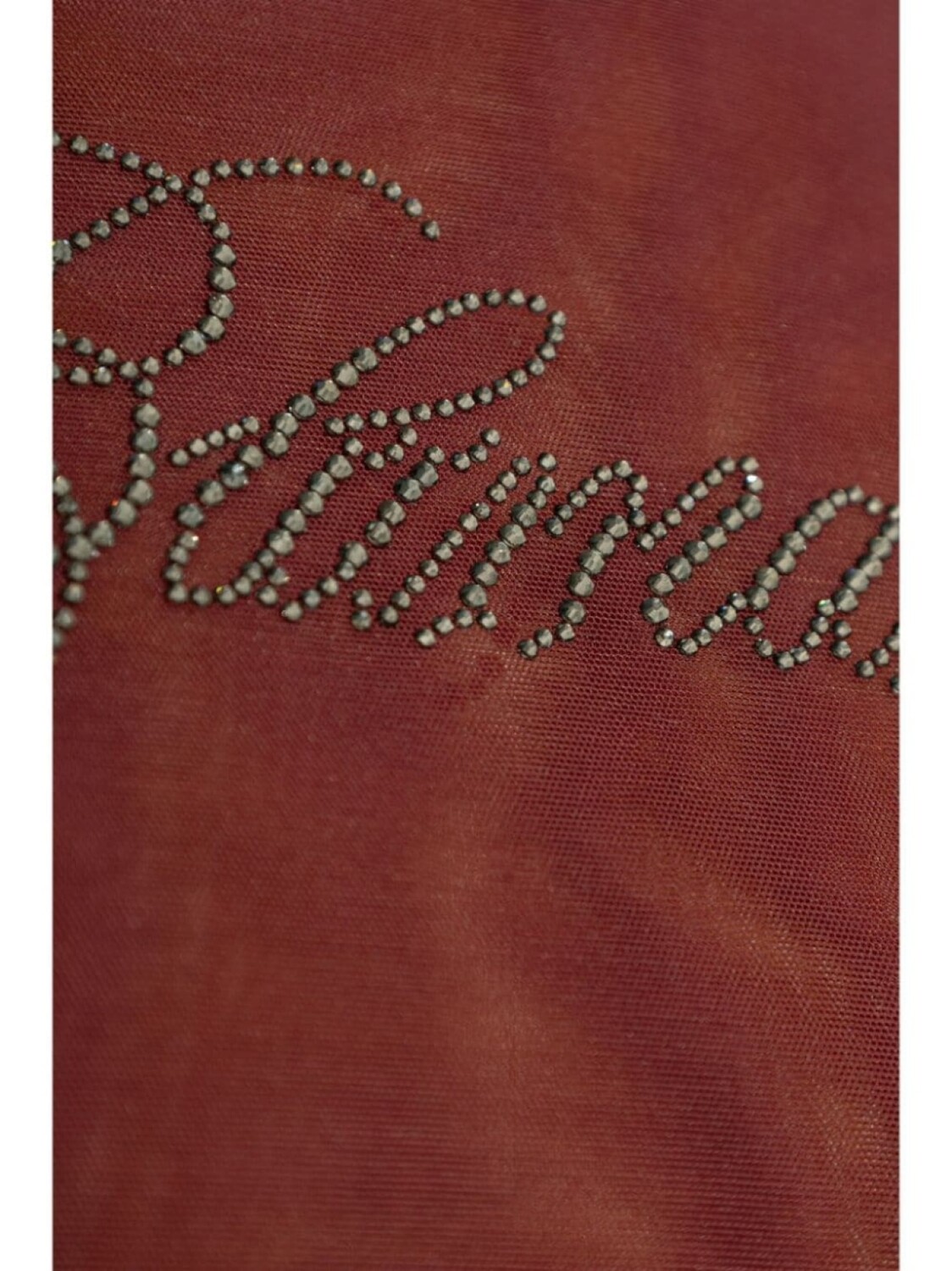 Бордовый сетчатый дизайн, стразы, логотип, круглый вырез, длинные прозрачные рукава, прямой подол
