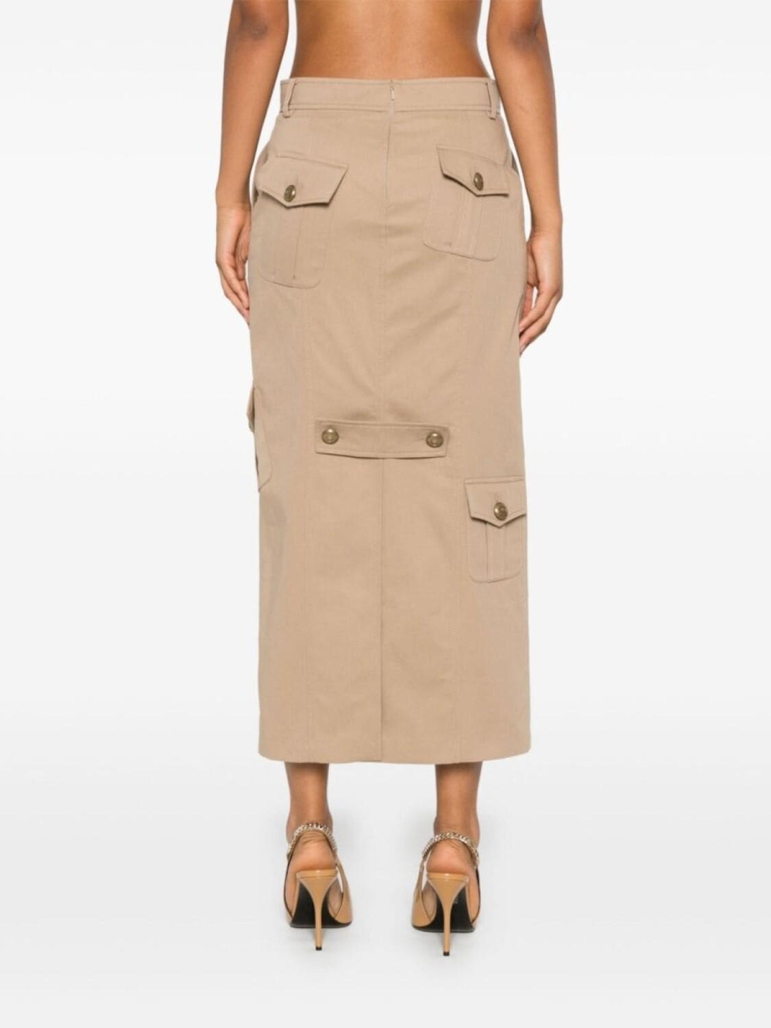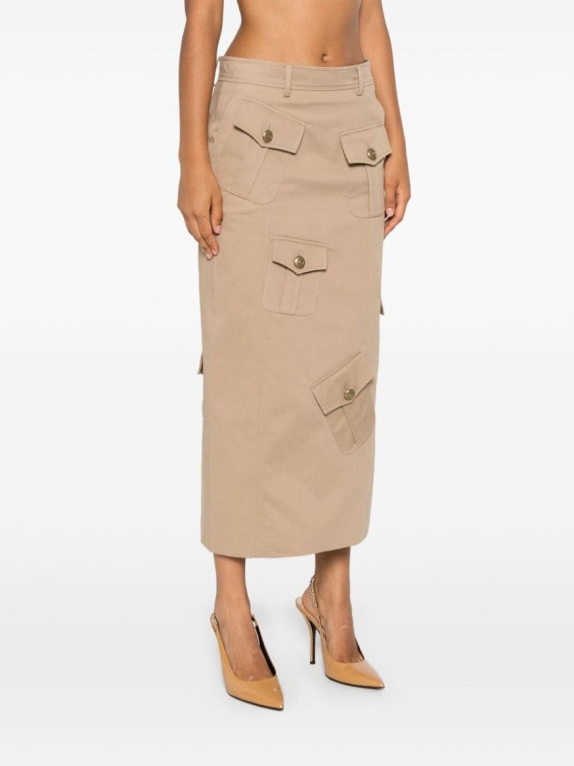 Бежевый хлопчатобумажно-шерстяной саржевый переплетение потайная застежка на крючок и молнию сзади высокая талия шлевки для ремня два боковых прорезных кармана несколько карманов-карго мартингейл сзади центральный шлица сзади прямой подол средней длины