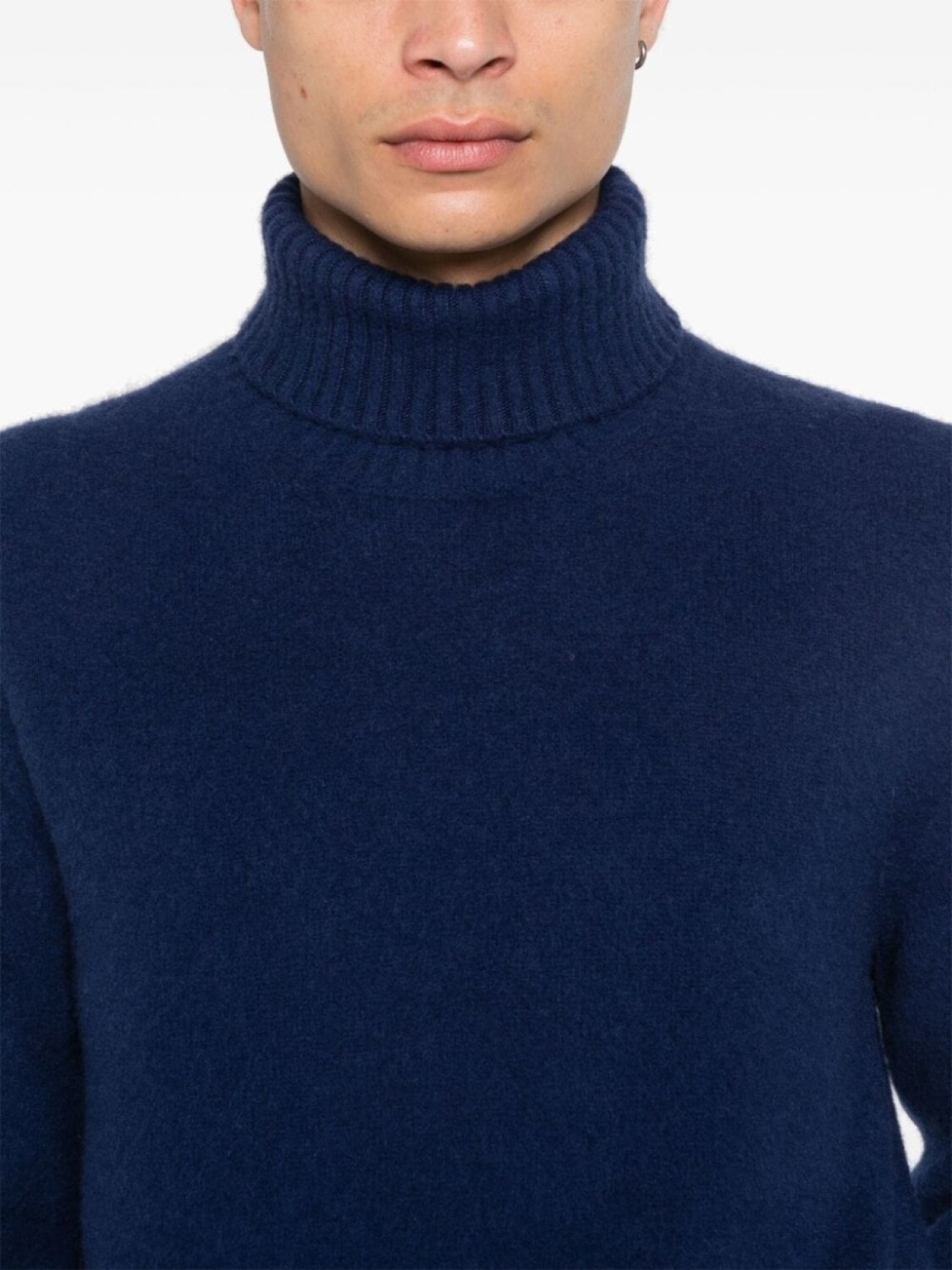 Темно-синяя шерстяная смесь с кашемиром, ребристый трикотаж, отделка в рубчик, эффект начеса, воротник-стойка, длинные рукава, прямой подол, без подкладки