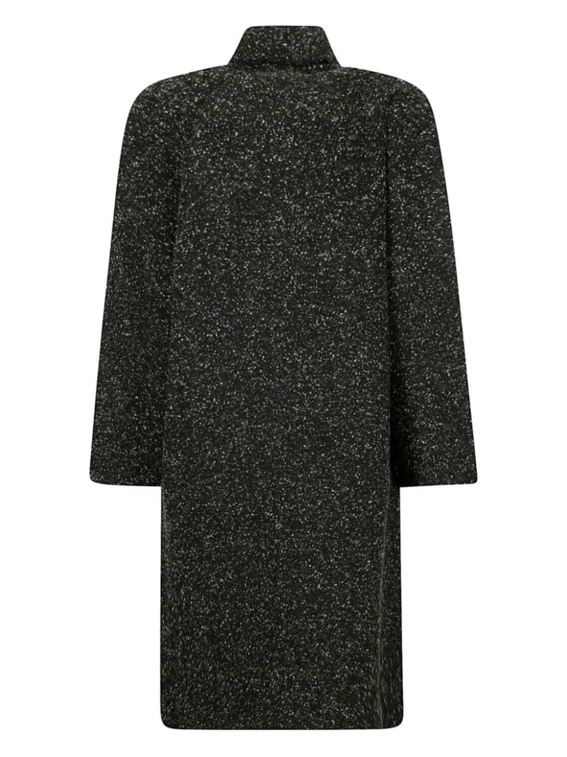 Смесь шерсти и кашемира черного/серого цвета, потайная застежка на пуговицы спереди, классический воротник, два боковых прорезных кармана, длинные рукава реглан, прямой подол, длина выше колена