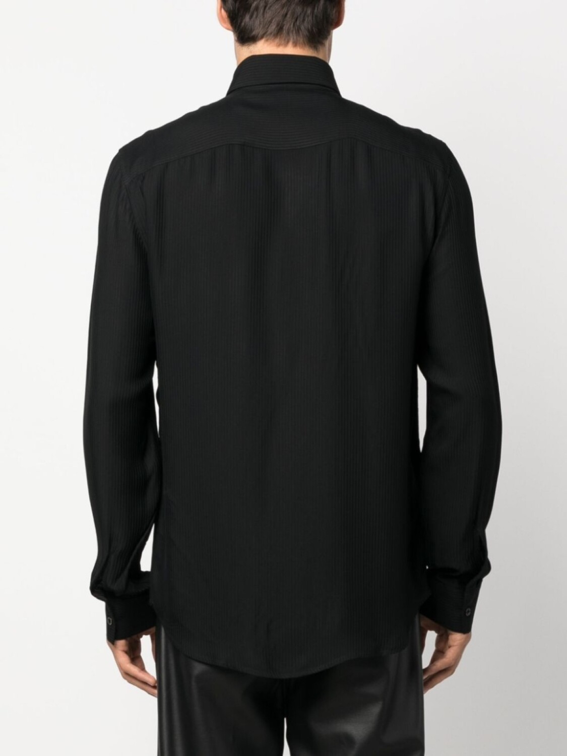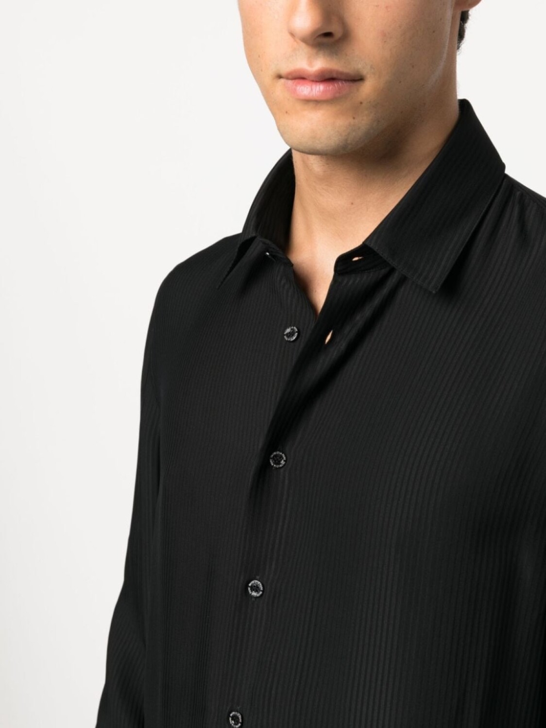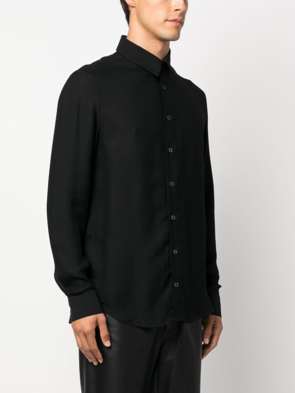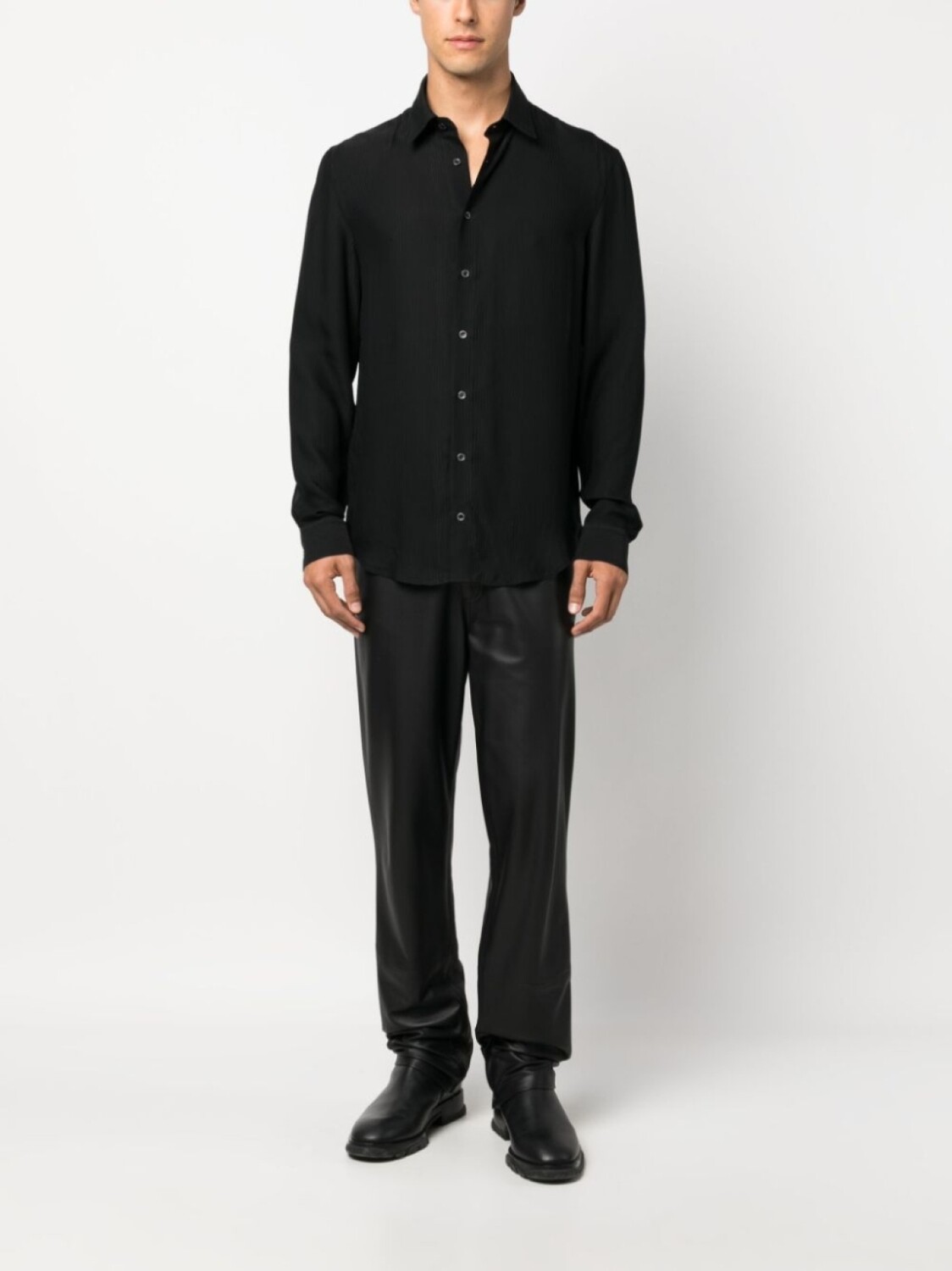 Черный, ткань с твиловым переплетением, классический воротник, застежка на пуговицах спереди, рукава с манжетами на пуговицах и закругленный подол.
