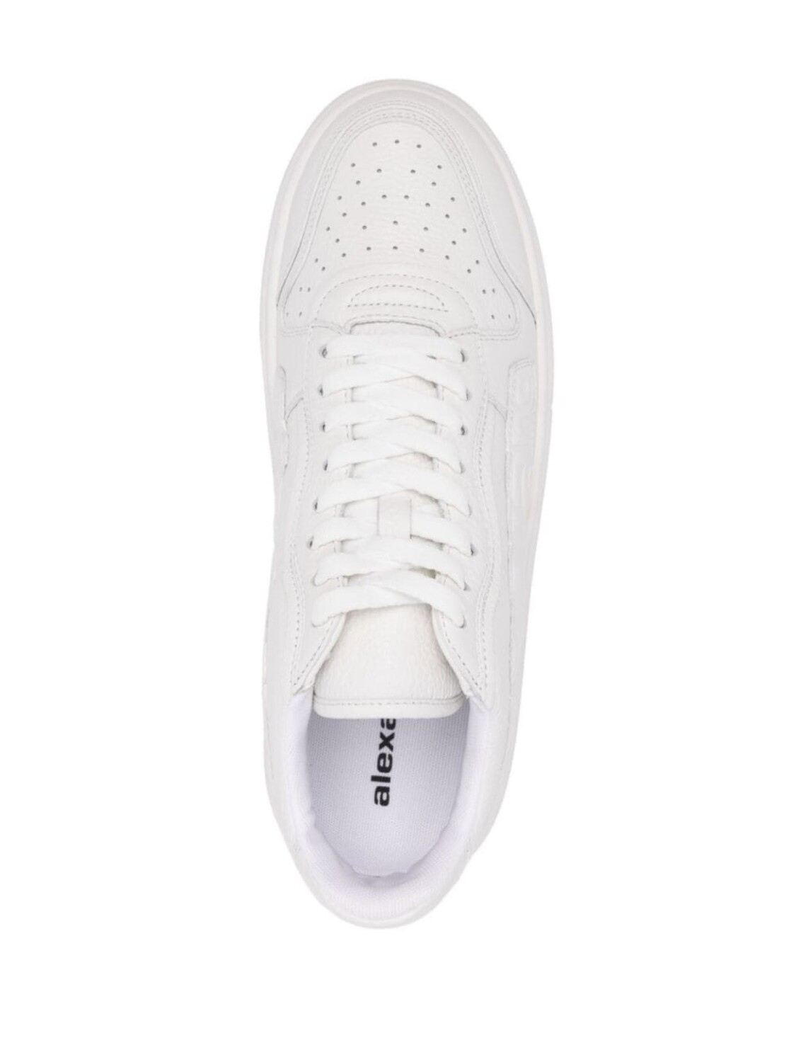 Белая телячья кожа, фактурная, с зернистой текстурой, круглый носок, перфорированный носок, тисненый логотип сбоку, фирменная стелька, сетчатая подкладка, плоская резиновая подошва, шнуровка спереди