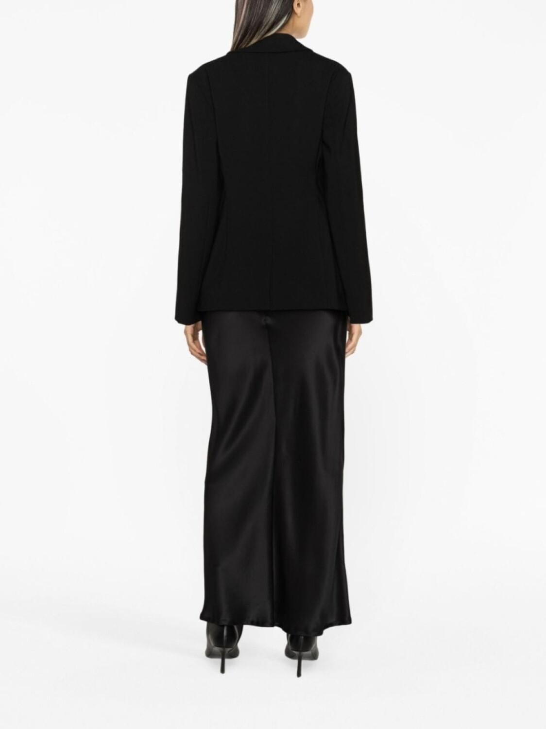 Черный, смесовая шерсть, зазубренные лацканы, потайная застежка спереди, длинные рукава, расклешенные манжеты, два прорезных кармана спереди, шлица по центру сзади, частичная подкладка и расклешенный подол.