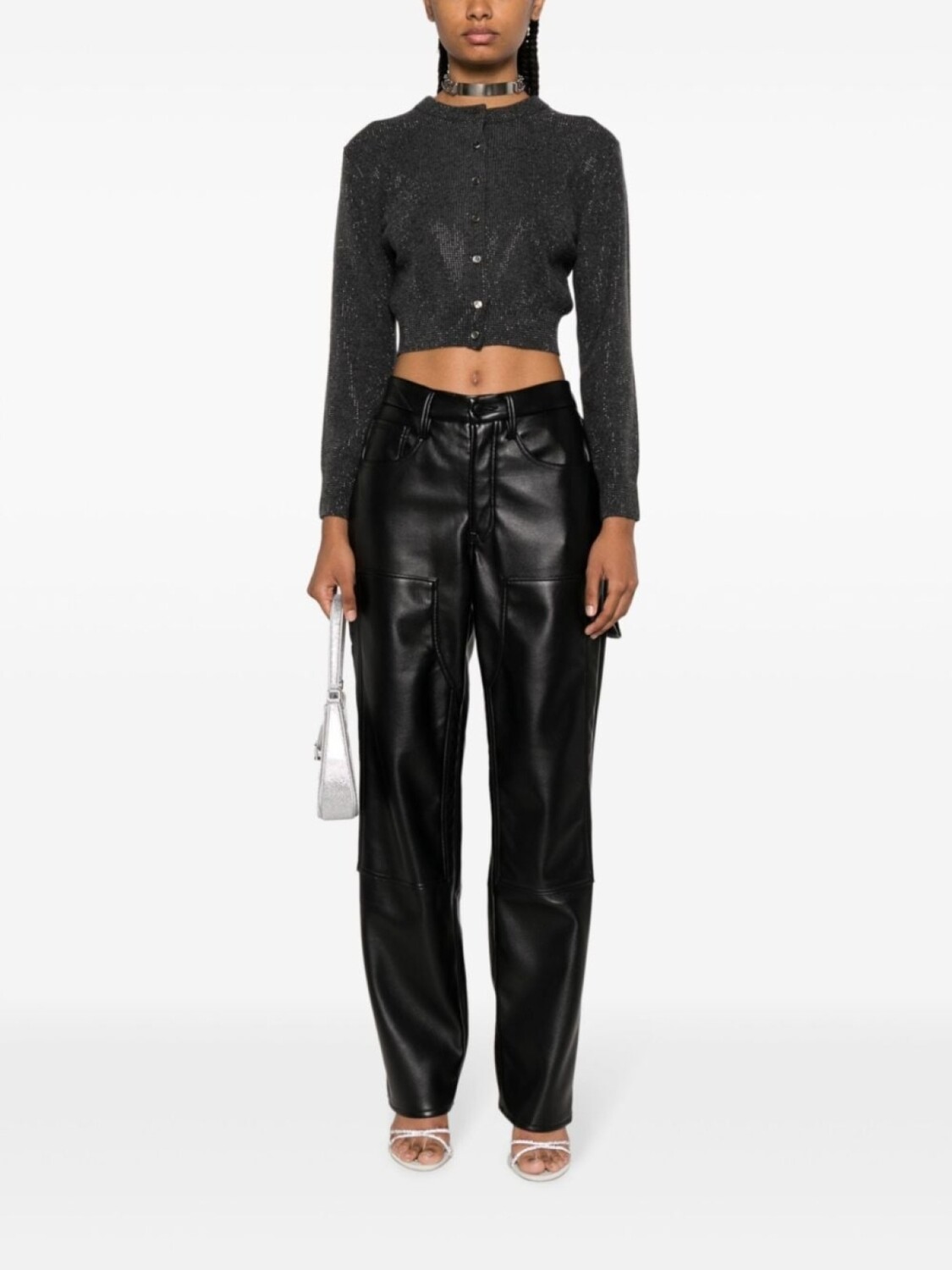 Антрацитово-серый, смесь шерсти и кашемира, логотип-аппликация, глянцевая фактура, круглый вырез, застежка на пуговицах спереди, длинные рукава, укороченная длина и прямой подол.