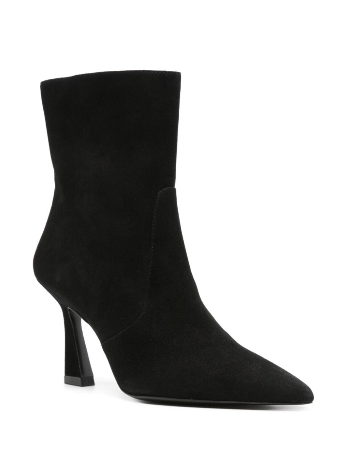 Черный, замша из телячьей кожи, застежка на молнии сбоку, скульптурный каблук 85 мм, заостренный носок, кожаная стелька с логотипом, кожаная подошва, В комплект входит мешок-пыльник для хранения.