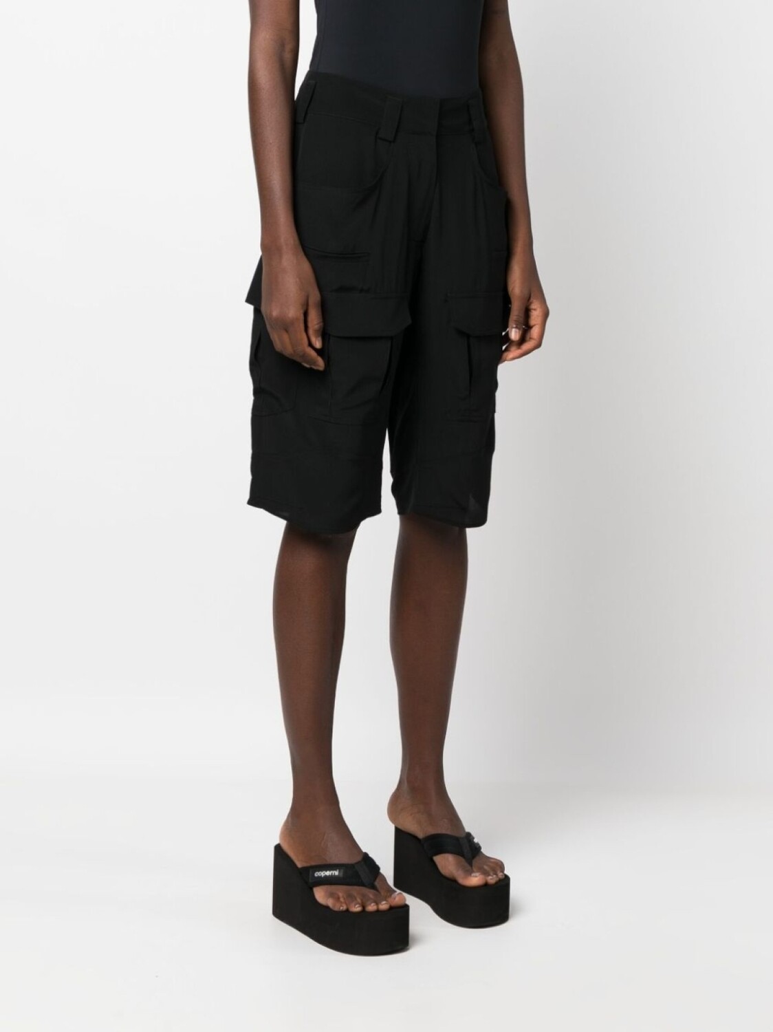 Черный, шелк, потайная застежка на молнии и пуговицах, два накладных кармана по бокам, два накладных кармана по бокам, петли для ремня, длина по колено, длина по колено и прямой подол.