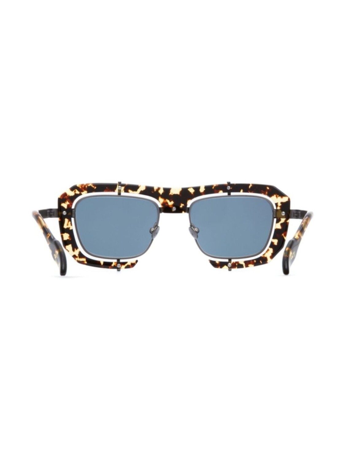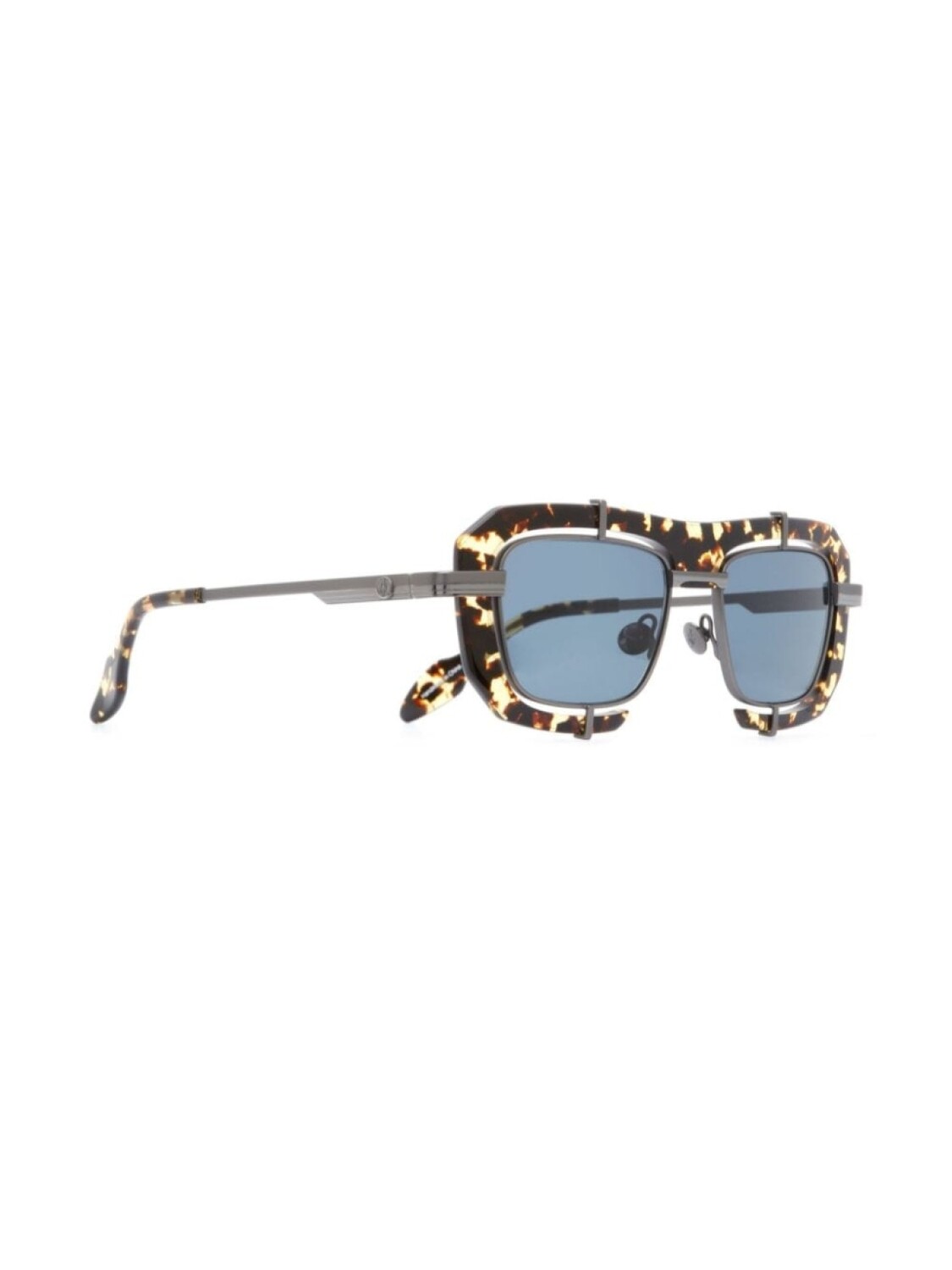 Оправа из кедрового коричневого ацетата с черепаховым эффектом, увеличенная длина, синие тонированные линзы, бляшка с логотипом на дужке, прямые дужки, изогнутые кончики. Очки поставляются с защитным футляром.
