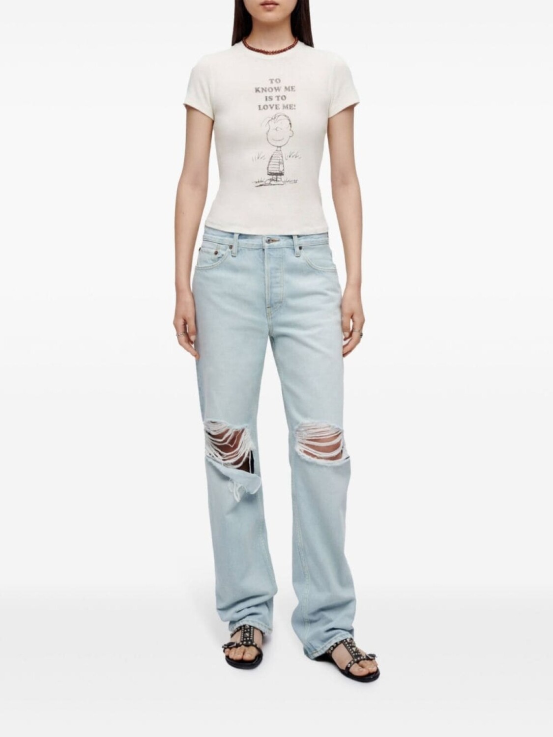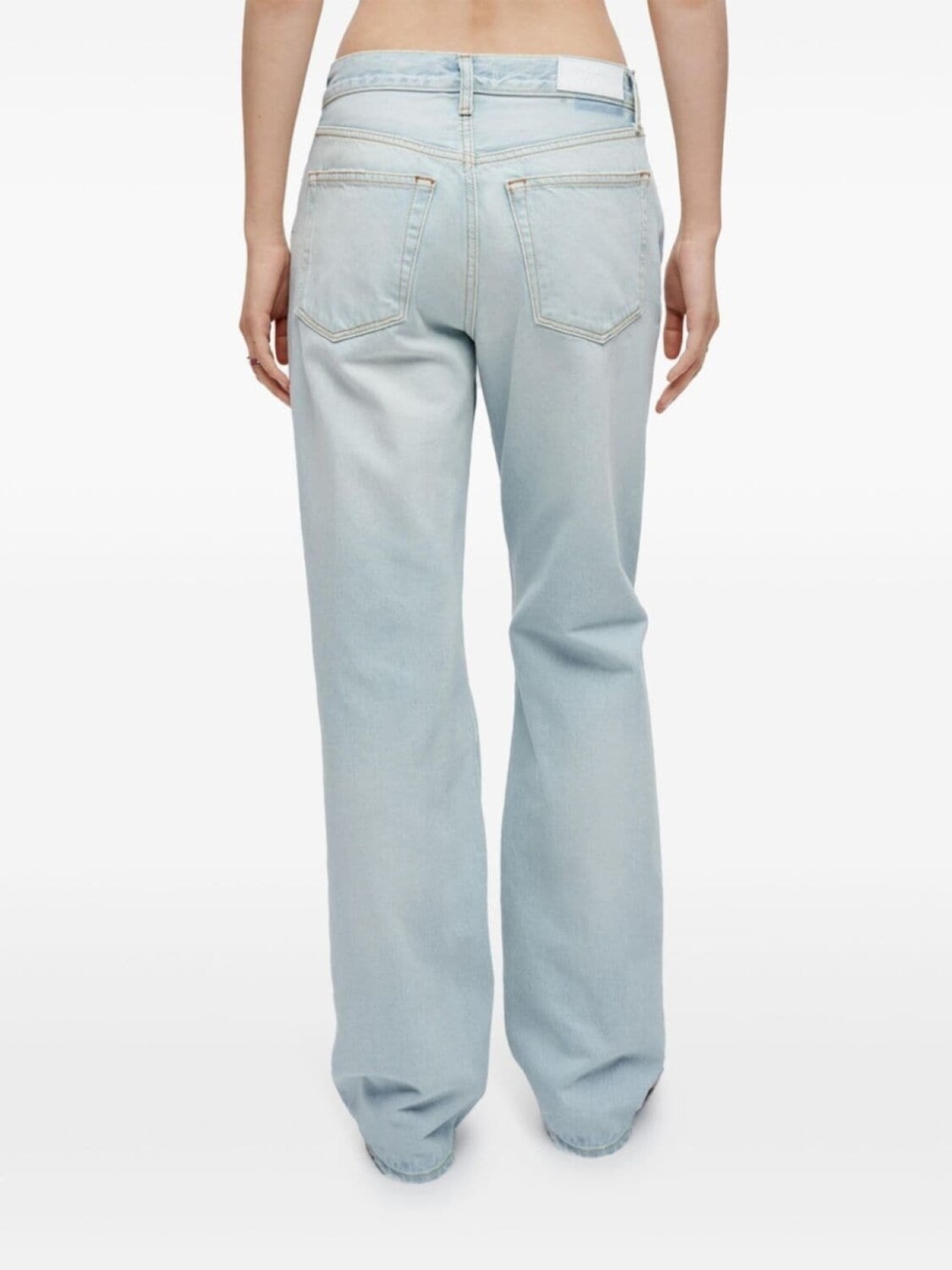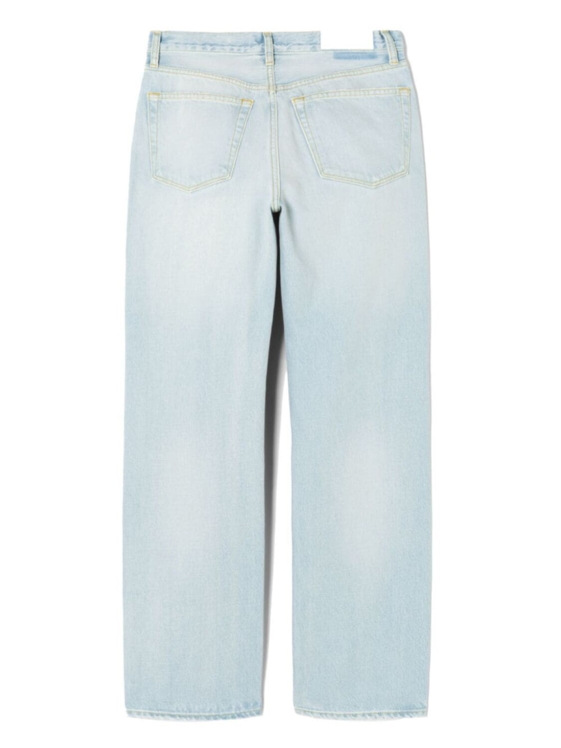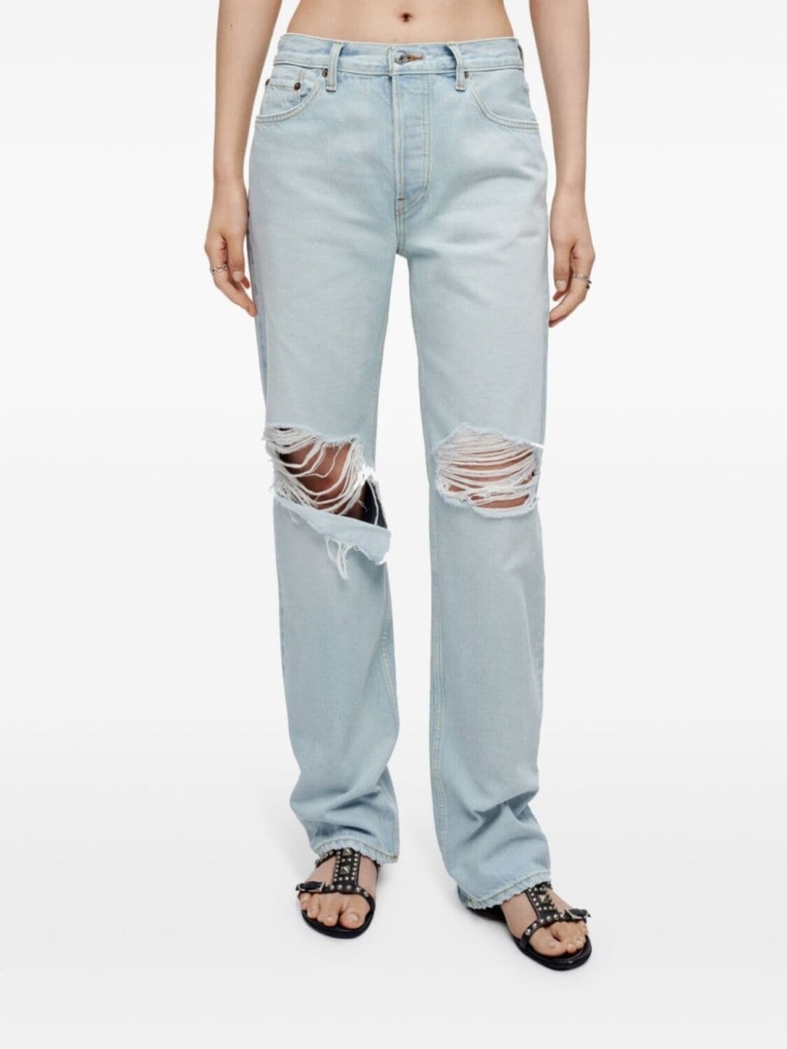 Светло-голубой хлопковый деним с эффектом потертости, рваные детали, заклепки, нашивка с логотипом сзади, шлевки для ремня, потайная застежка на пуговицы, пять классических карманов, фасон «бойфренд»