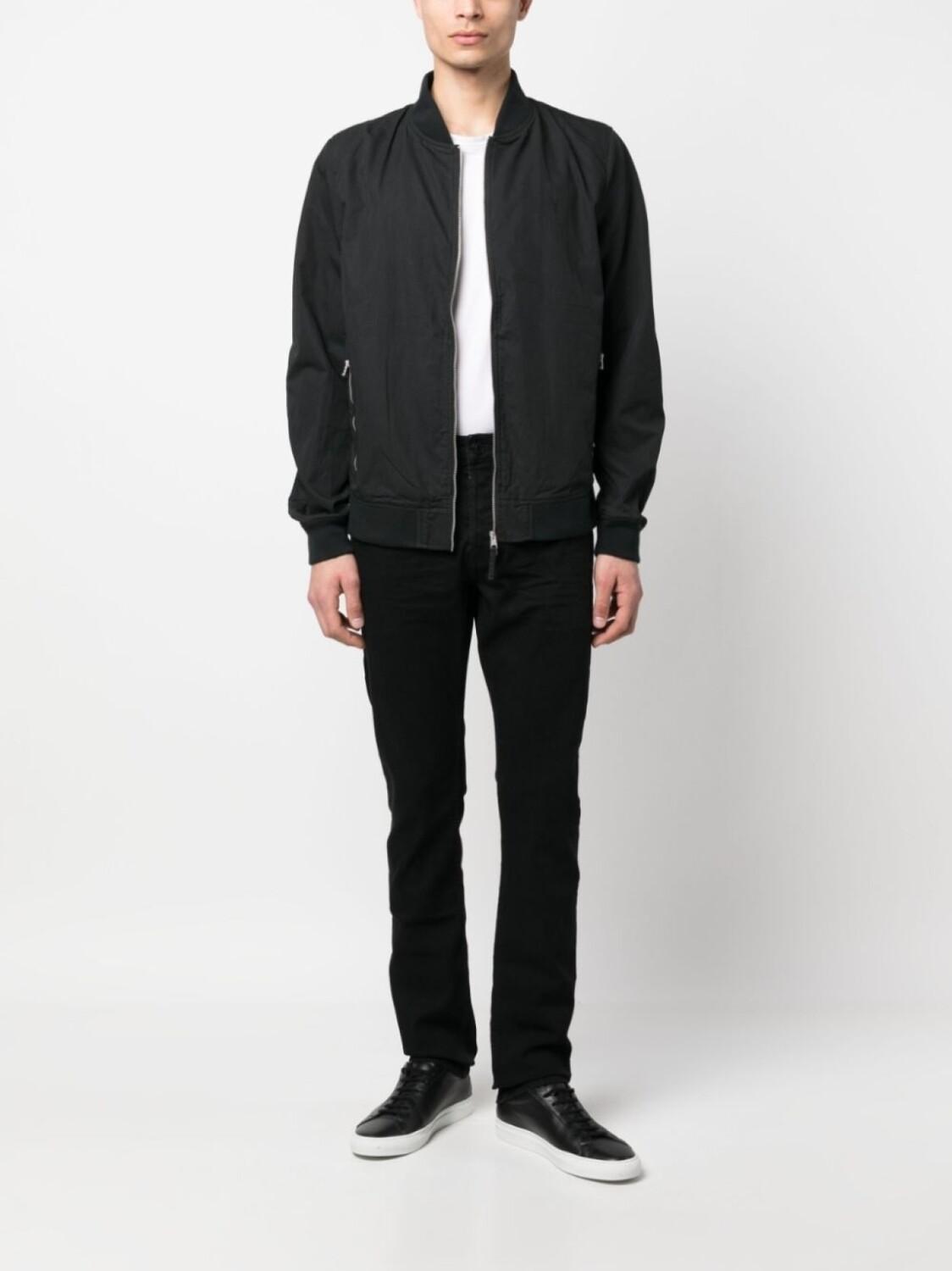 Черный, эластичный хлопок, воротник-стойка, застежка на молнии спереди, передние карманы на молнии, длинные рукава, эластичные манжеты и прямой подол.