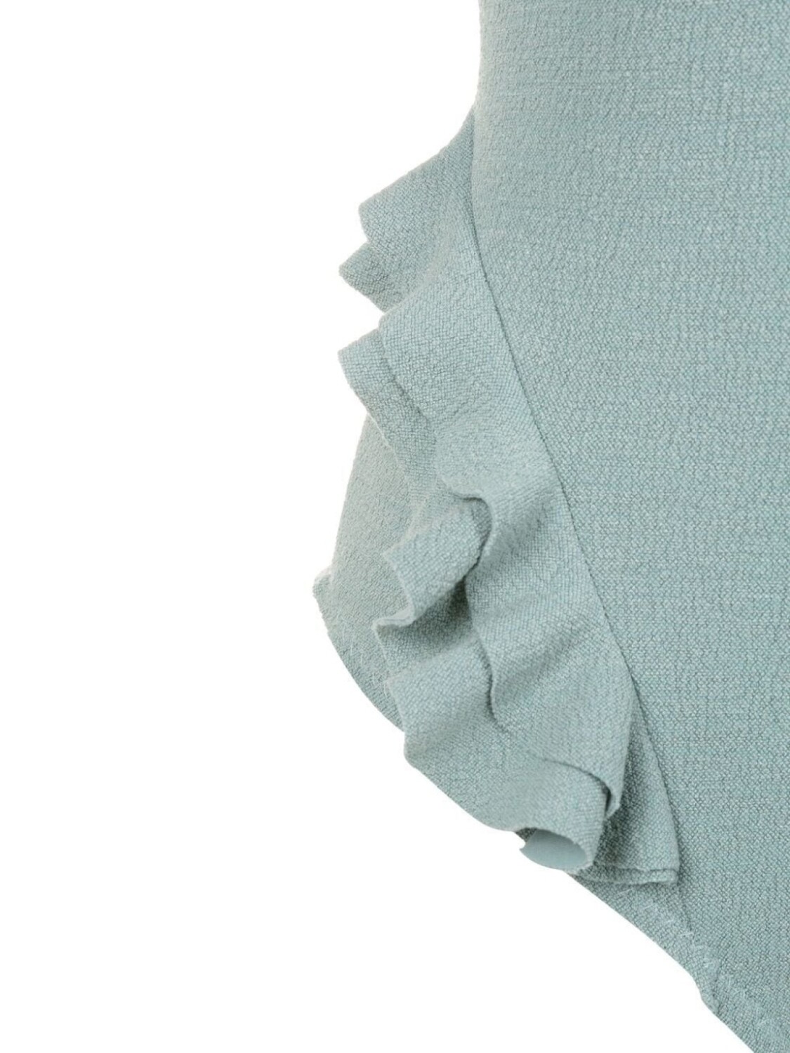 Бирюзовый, эластичный материал, квадратный вырез, присборенный воротник, края с фестонами, перекрестные бретели на спине и среднее покрытие. Пожалуйста, примеряйте купальники и пляжные шорты только поверх собственного белья.