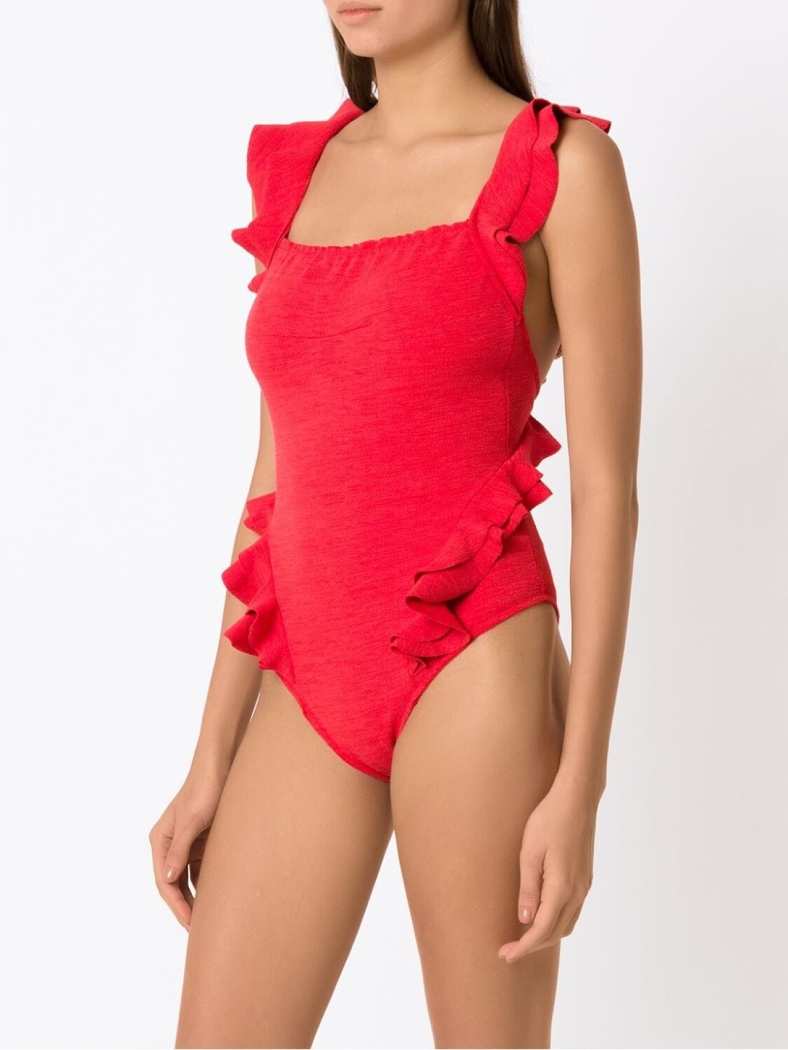 Вставки с оборками, квадратный вырез и без рукавов. Пожалуйста, примеряйте купальники и пляжные шорты только поверх собственного белья.