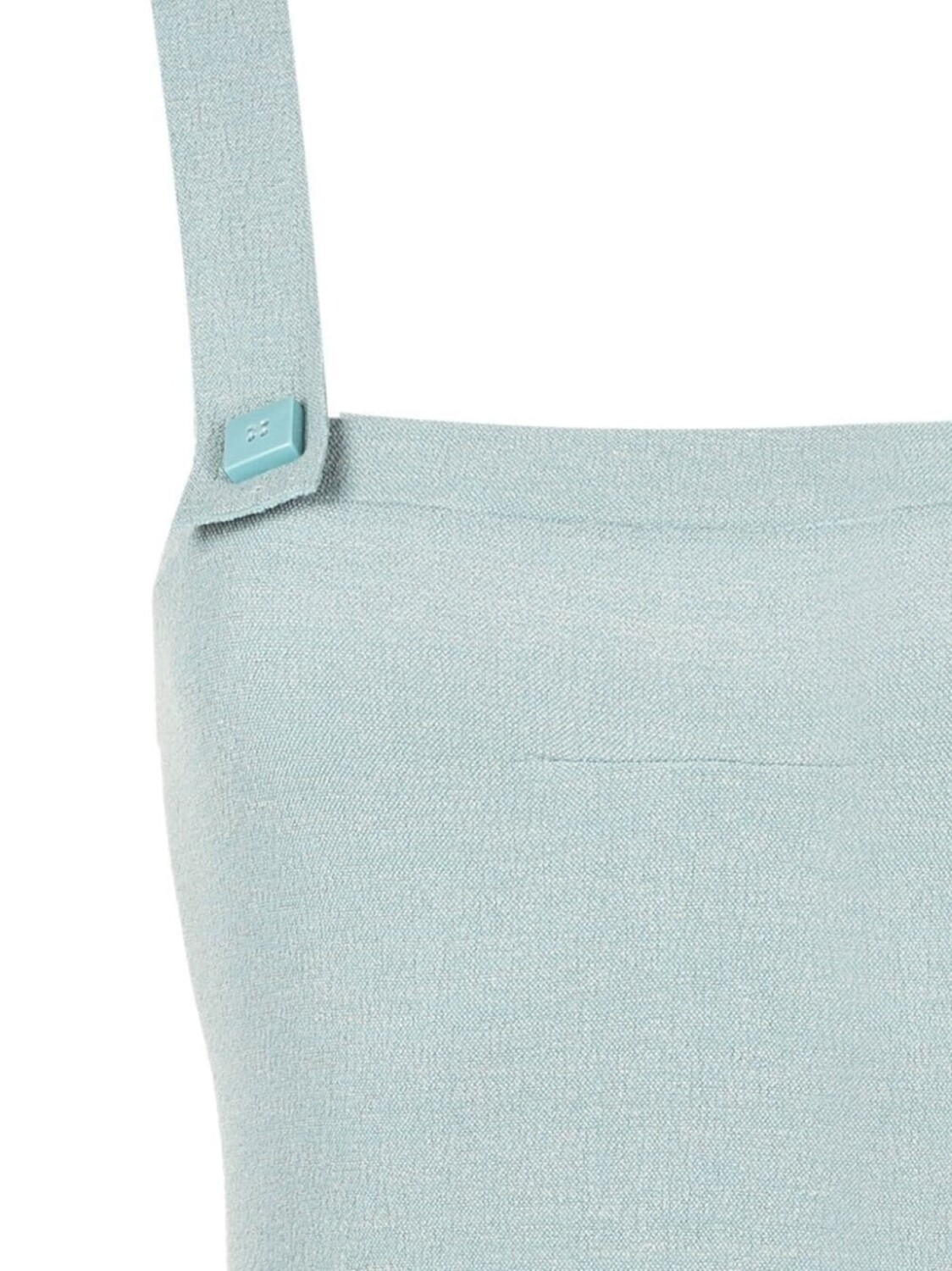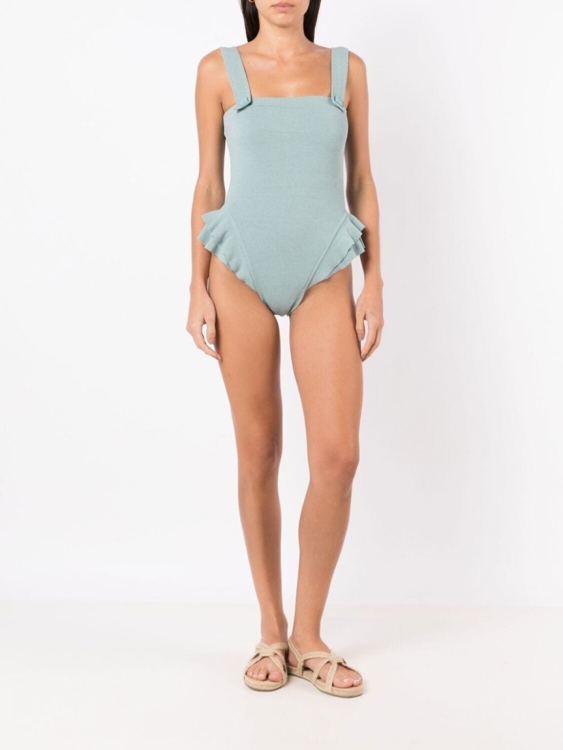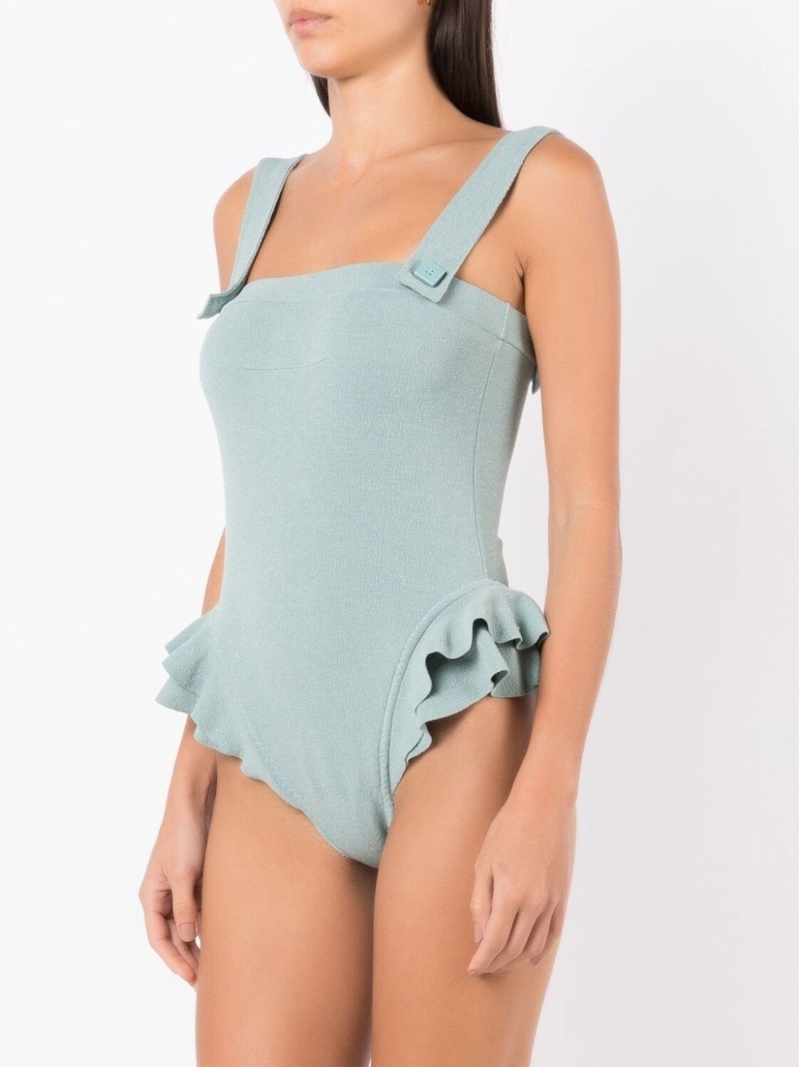 Бирюзовый, эластичный материал, квадратный вырез, тонкие ремешки, присборенный воротник и среднее покрытие. Пожалуйста, примеряйте купальники и пляжные шорты только поверх собственного белья.