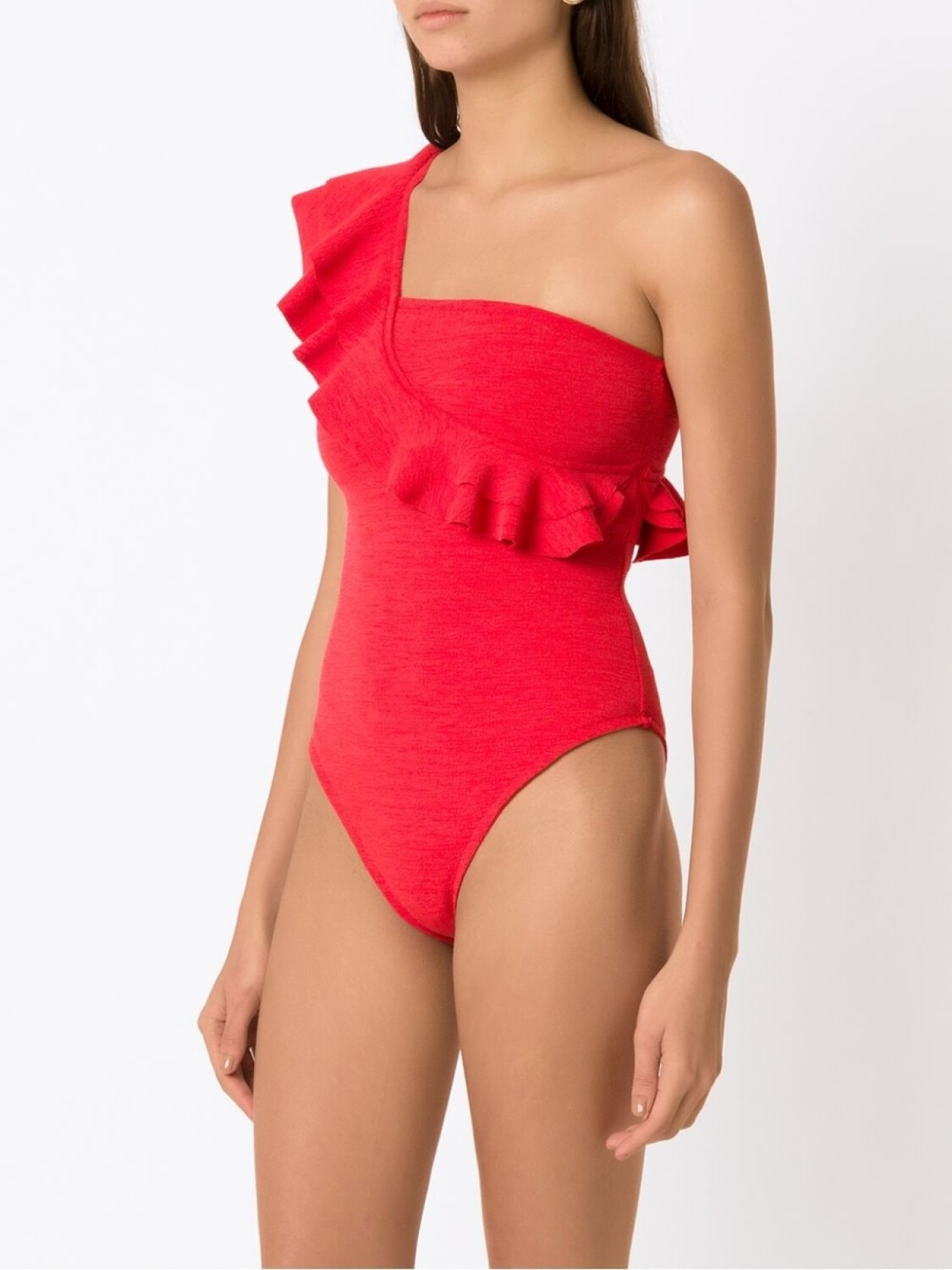 Эластичная модель, вставки с оборками, вырезные детали и модель на одном плече. Пожалуйста, примеряйте купальники и пляжные шорты только поверх собственного белья.