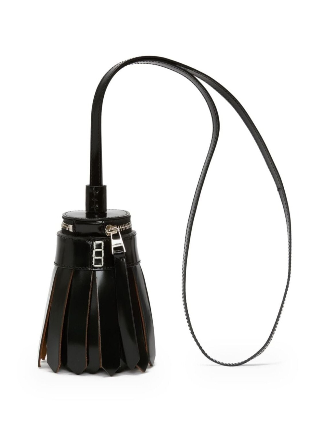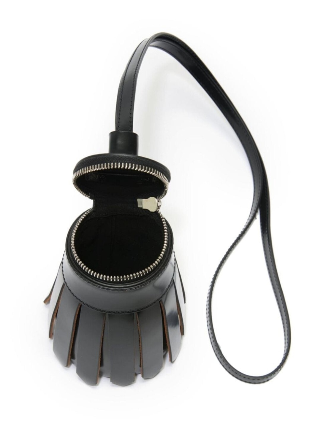 Черная телячья кожа с гладким зерном, крупная кисточка, серебристая фурнитура, застежка-молния сверху, один плечевой ремень, основное отделение, подкладка из микрозамши