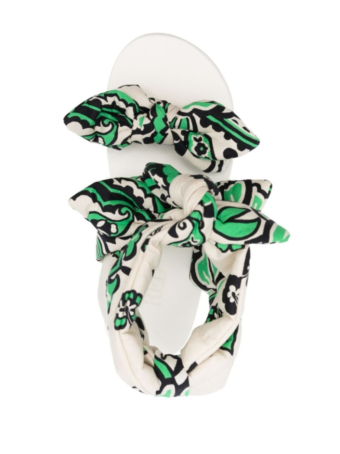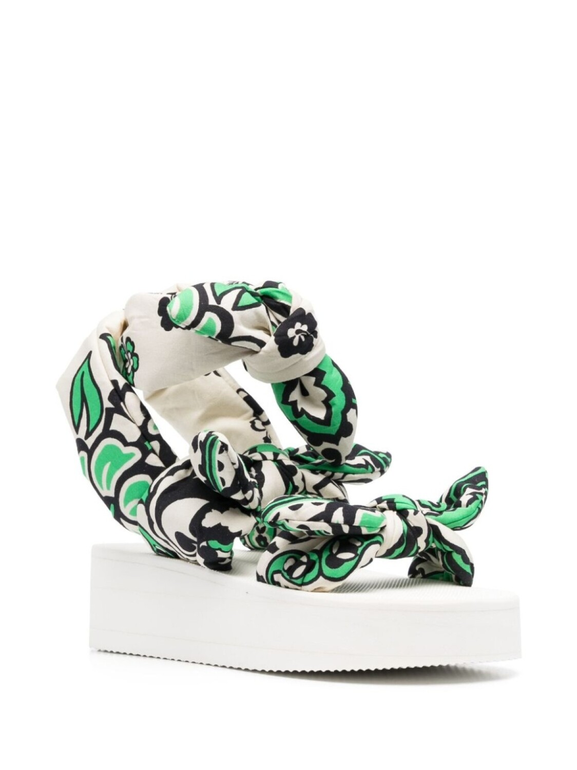 Изумрудно-зеленый, белый, тканевый ремешок, открытый носок, завязки спереди и подошва на платформе.