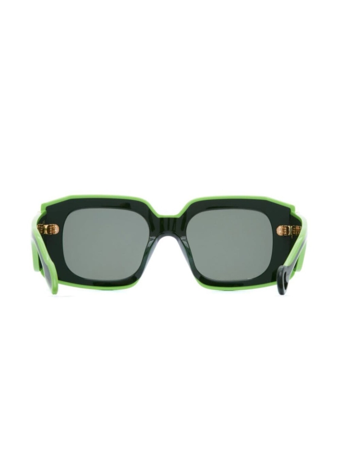 Оправа из темно-зеленого ацетата увеличенного размера, зеленые тонированные линзы, бляшка с логотипом на дужке, рельефные дужки, изогнутые кончики. Очки поставляются с защитным футляром.