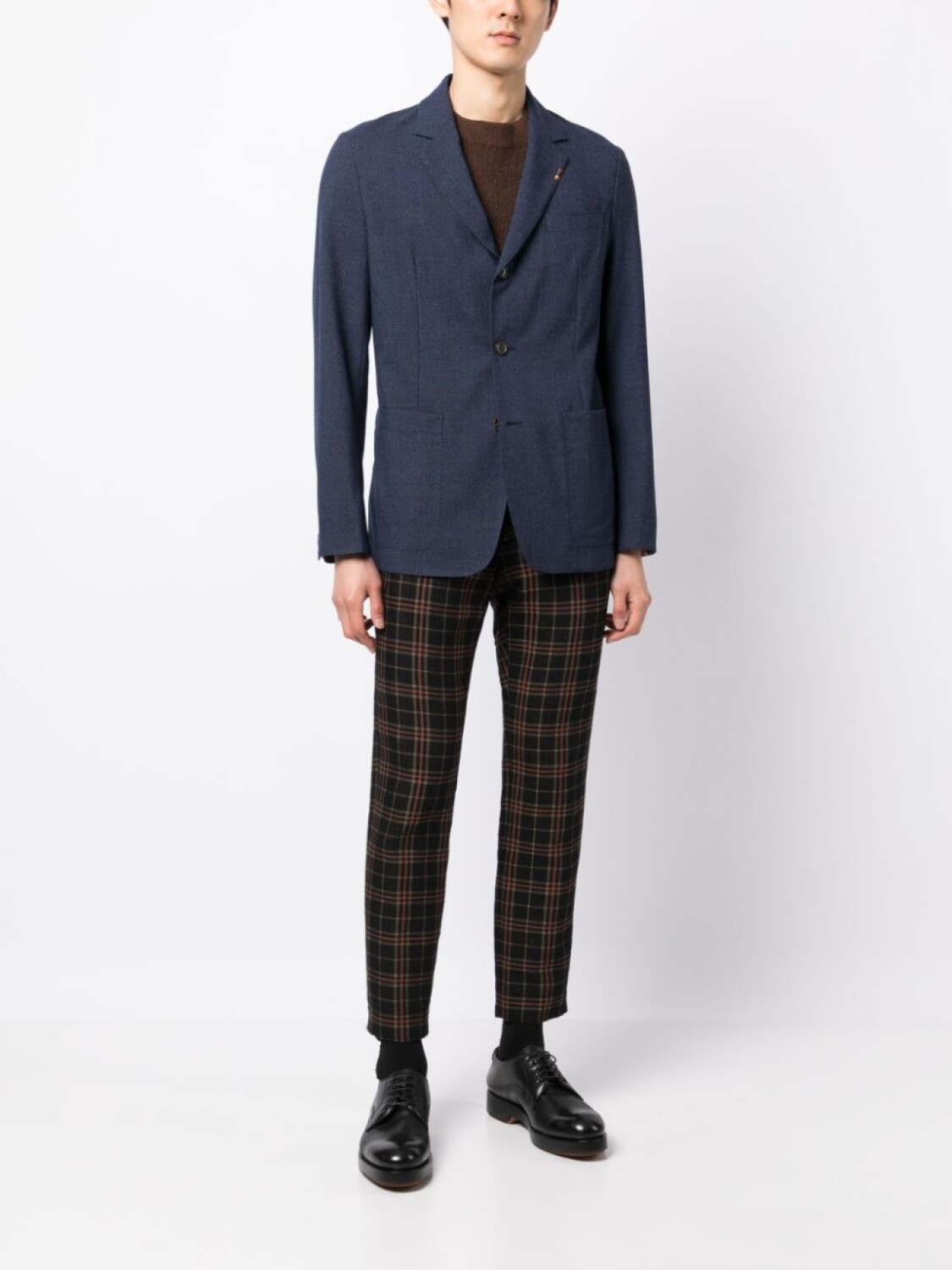 Синий, шерсть, узкие зазубренные лацканы, застежка на пуговицах спереди, длинные рукава, манжеты на пуговицах, прорезной карман на груди, два накладных кармана спереди, прямой подол и шлица по центру сзади.