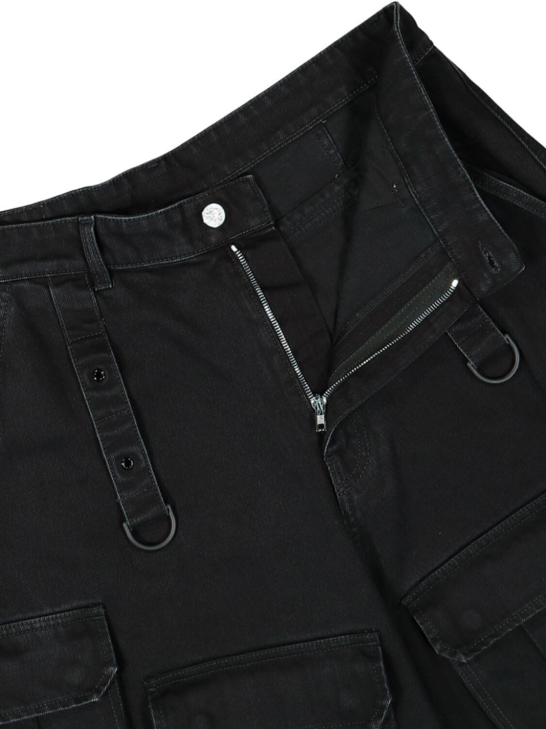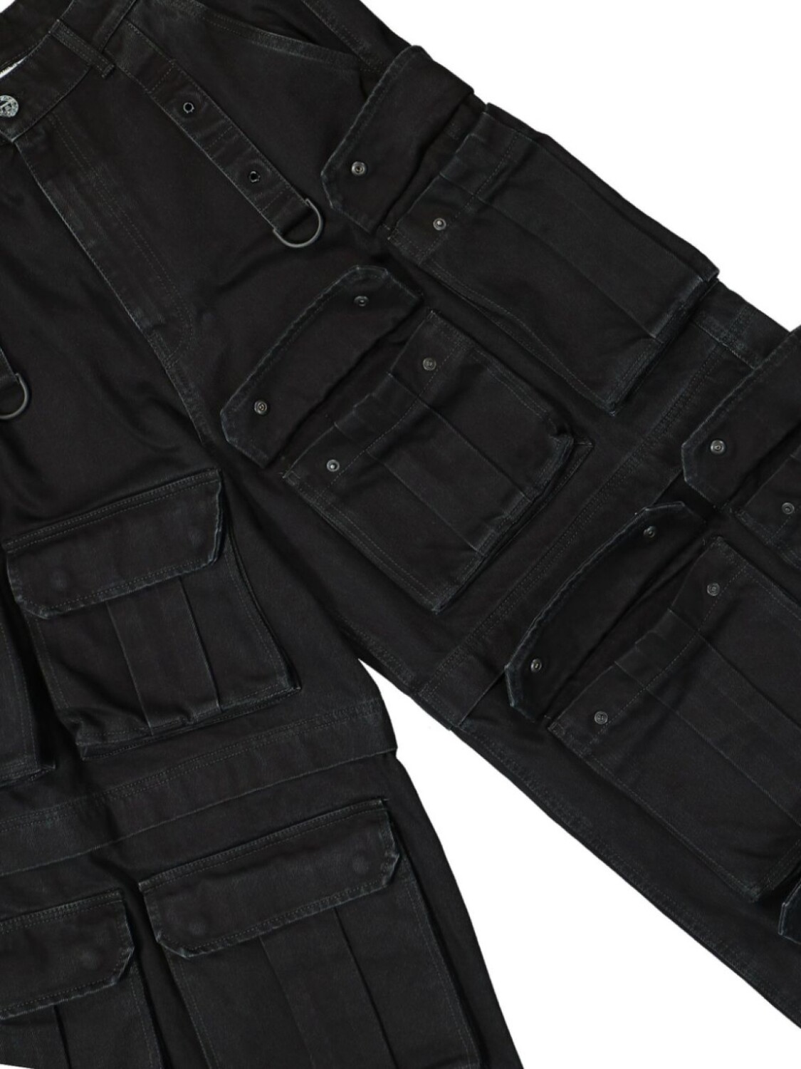 Черный хлопковый деним, несколько карманов-карго, застежка на пуговицы, шлевки для ремня, нашивка с логотипом сзади, два кармана с клапанами сзади, широкие штанины