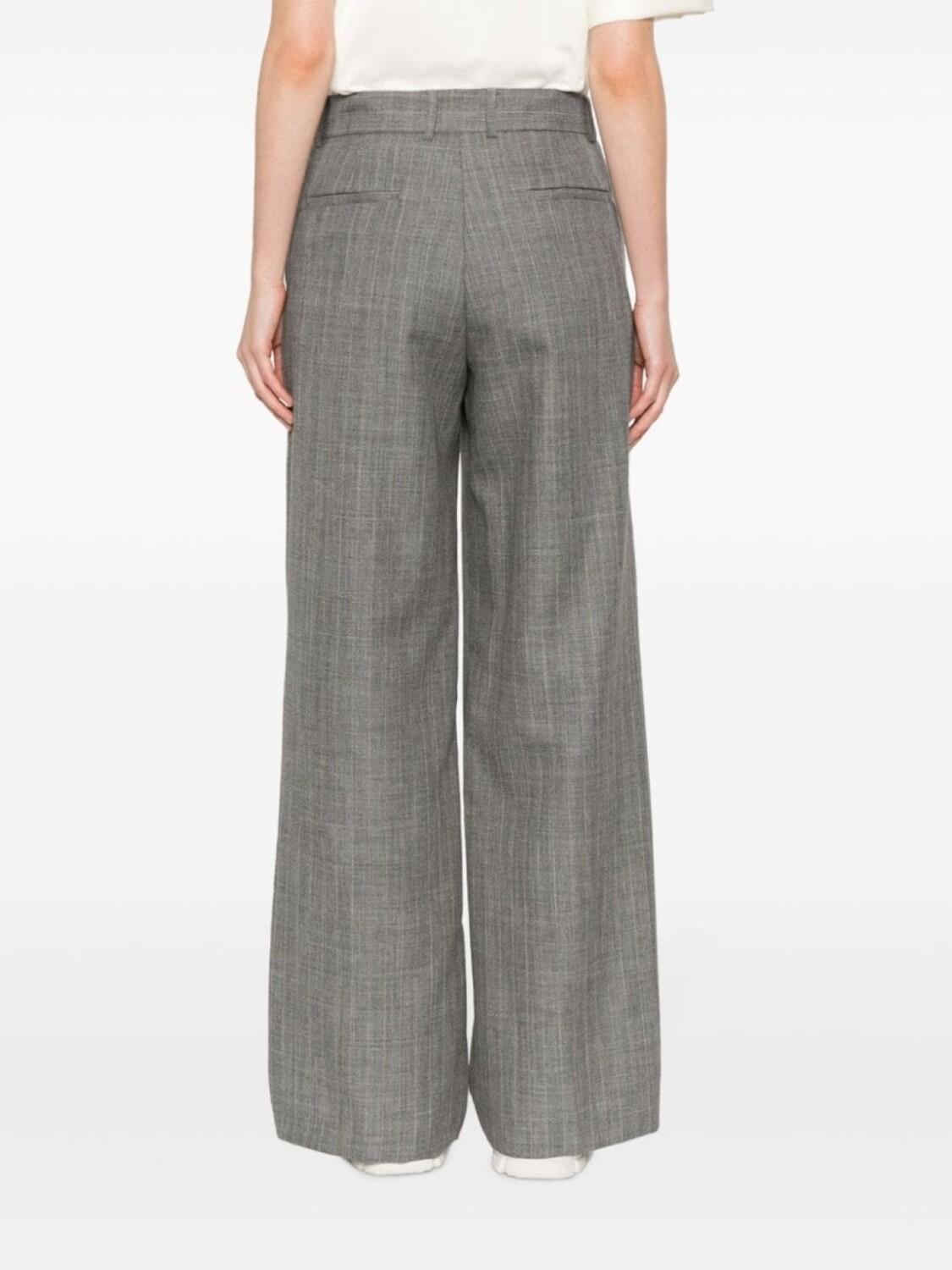 Серый, шерсть, завышенная талия, стрелки, петли для ремня, потайная пуговичная застежка спереди, два кармана по бокам, два кармана с листочкой сзади, широкий крой и прямой подол.