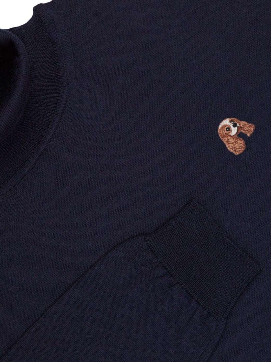 Темно-синяя мериносовая шерсть, тонкая вязка, ребристый край, аппликация, высокий ворот, длинные рукава, прямой подол. При покупке этого изделия унисекс имейте в виду, что оно соответствует стандартным мужским размерам.