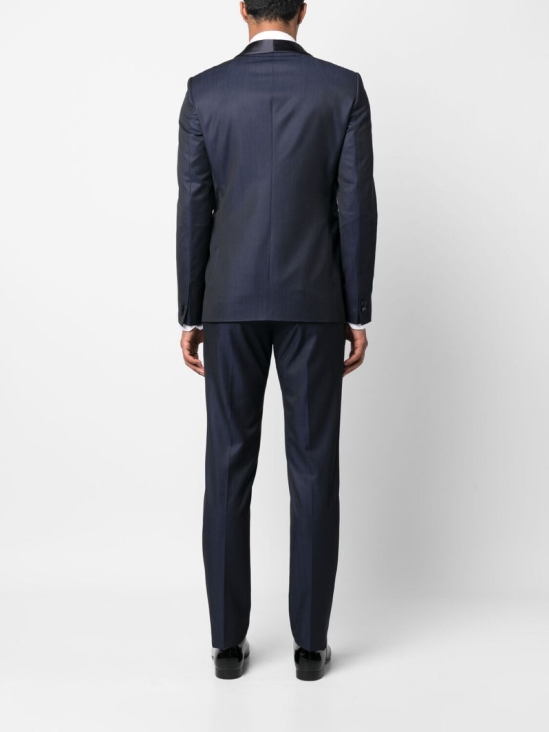 Темно-синий, шерсть, контрастные лацканы, лацканы-шалька, застежка на пуговицах спереди, длинные рукава, цельная подкладка и два прорезных кармана сбоку.