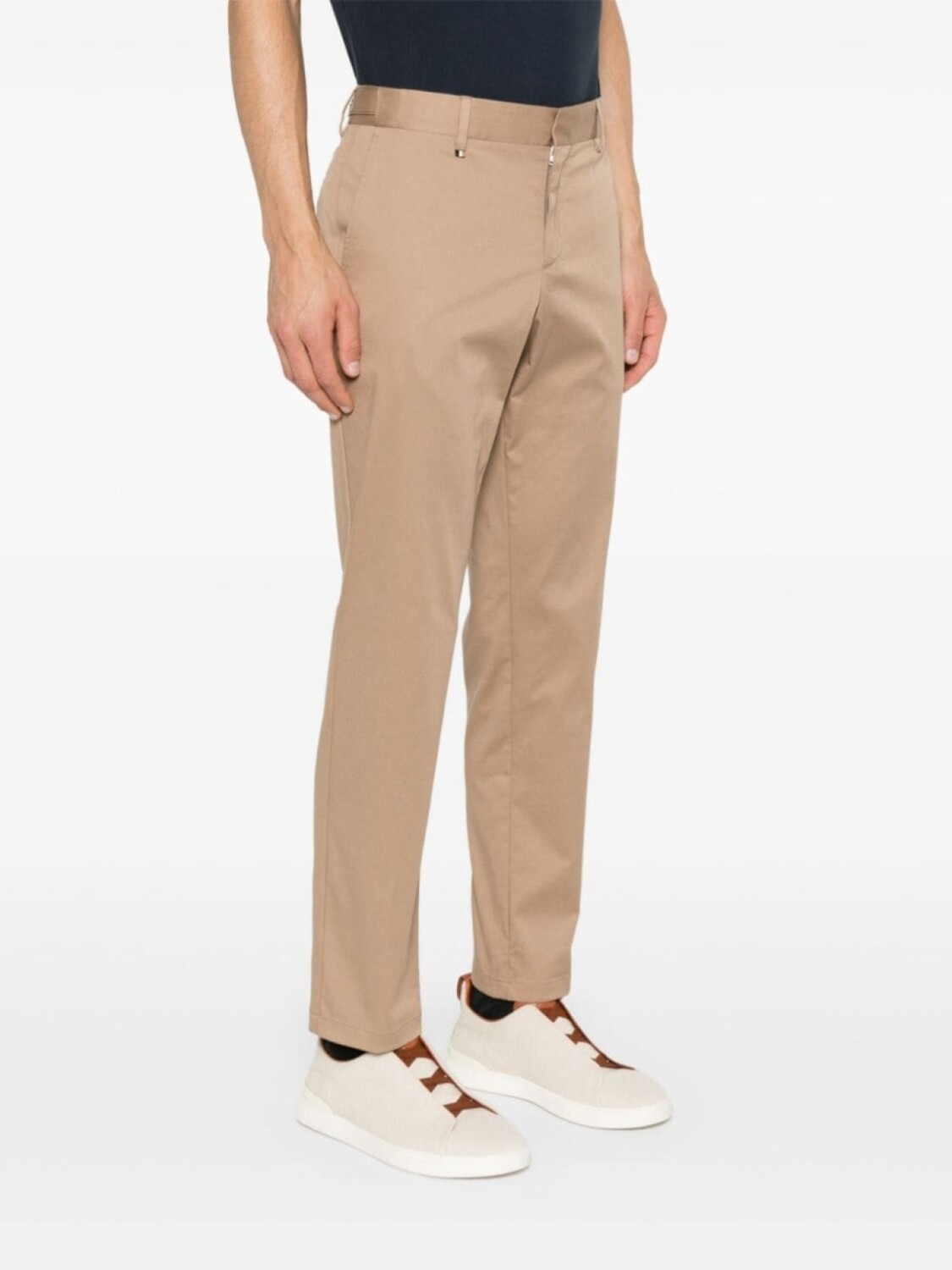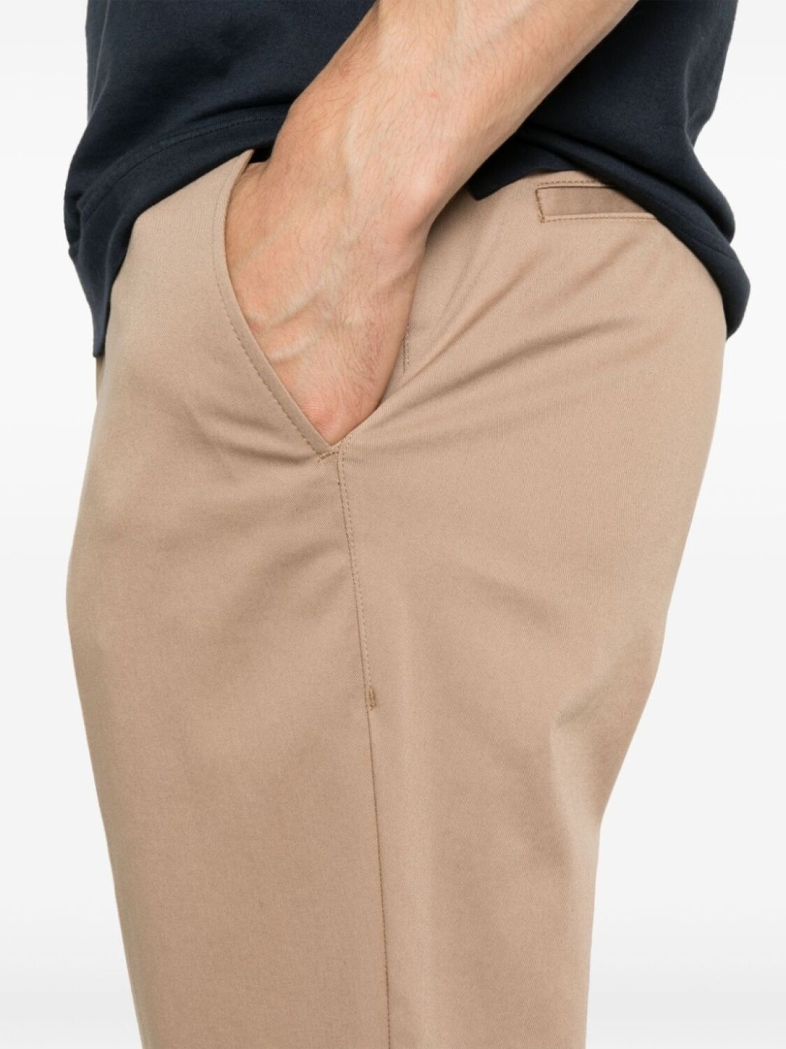 Коричневый хлопковый саржевого переплетения, заглаженные складки, шлевки для ремня, два боковых врезных кармана, два задних прорезных кармана, прямой штанин, застежка на крючок и молнию