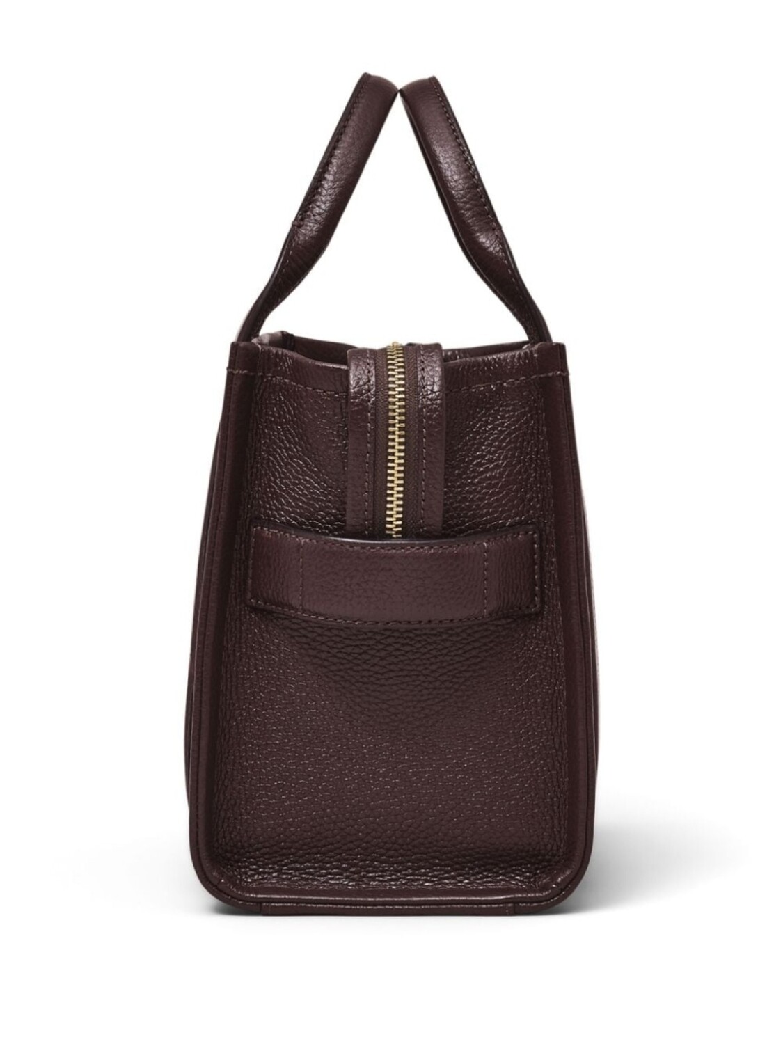 Коричневый, кожа, зернистая текстура, тисненый логотип спереди, нашивка с логотипом сзади, съемный регулируемый ремень на плечо, круглые ручки, застежка на молнии сверху, нашивка с логотипом внутри, внутренние прорезные карманы и основное отделение.