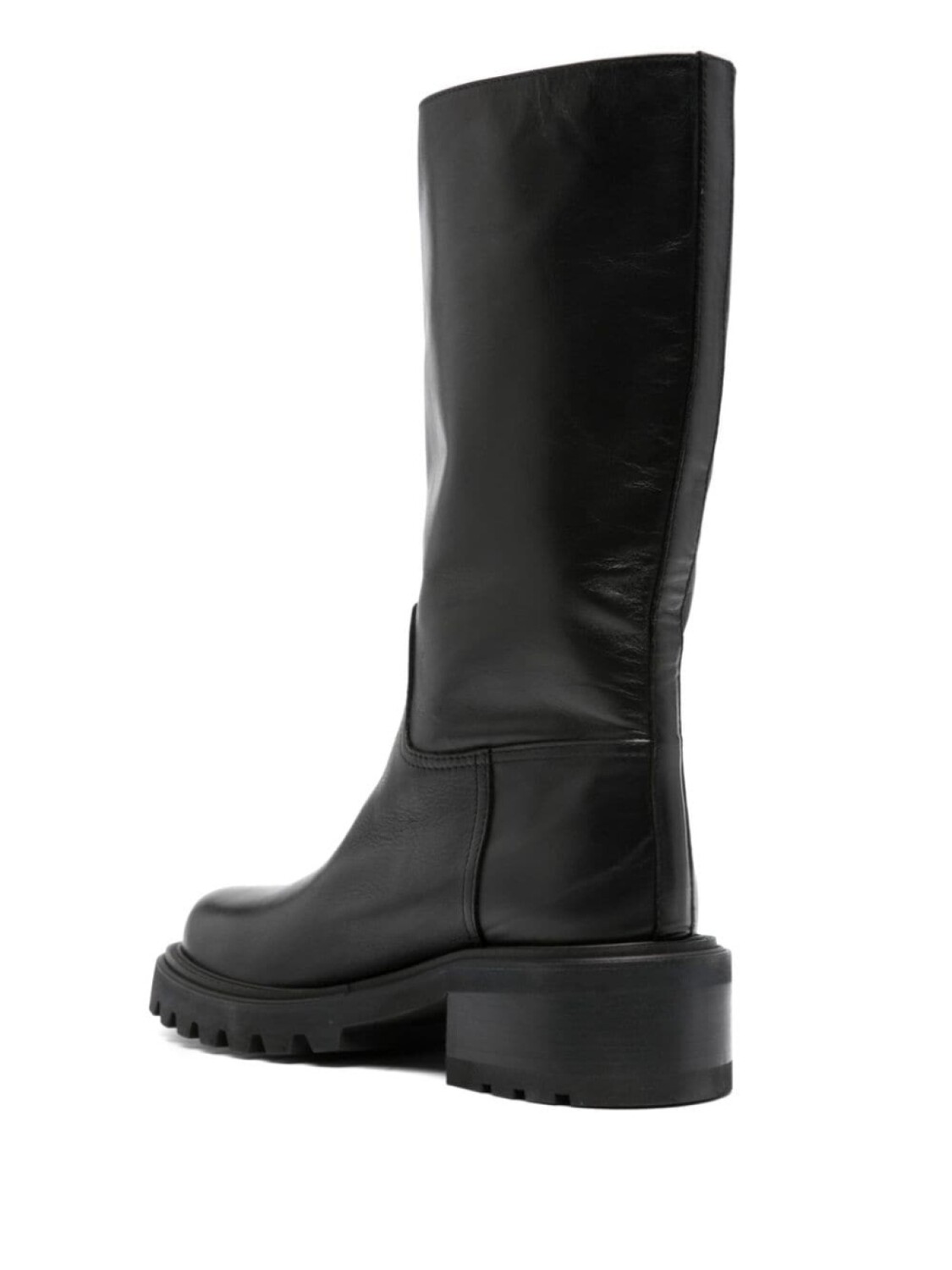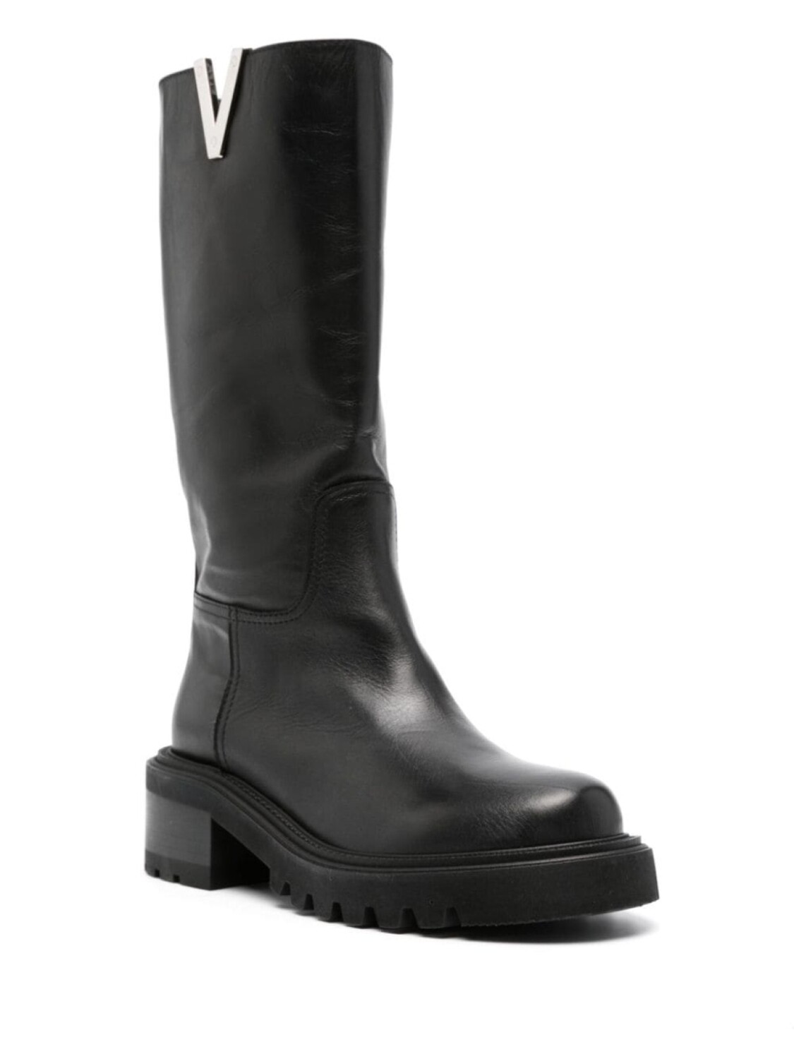 Черный, телячья кожа, декор VLogo Signature, серебристая фурнитура, закругленный носок, высота по колено, кожаная подкладка, стелька с логотипом, блочный каблук средней высоты и резиновая подошва.
