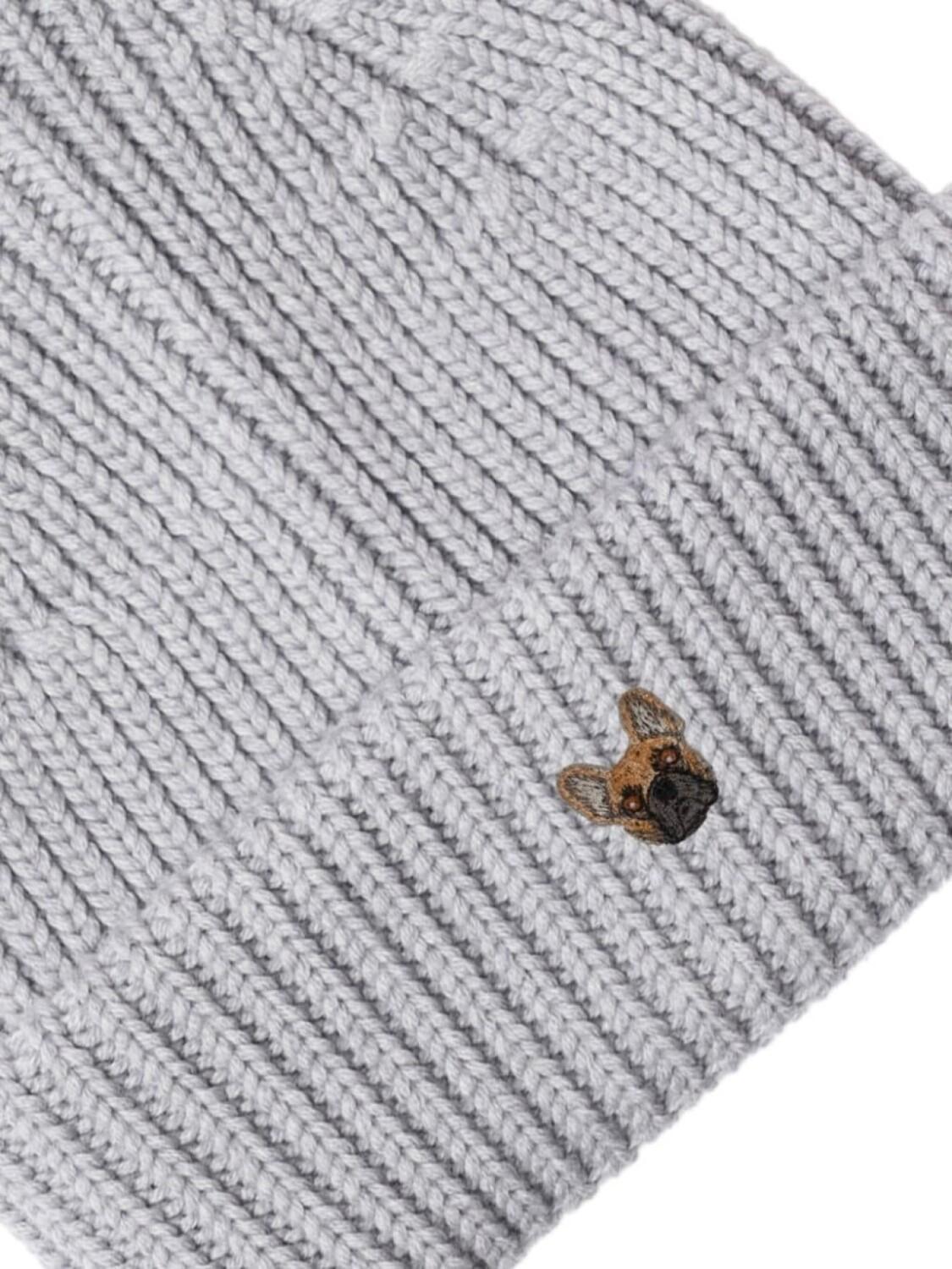 Серая мериносовая шерсть, ребристая вязка, вышитый мотив собаки, отворот, круглая тулья