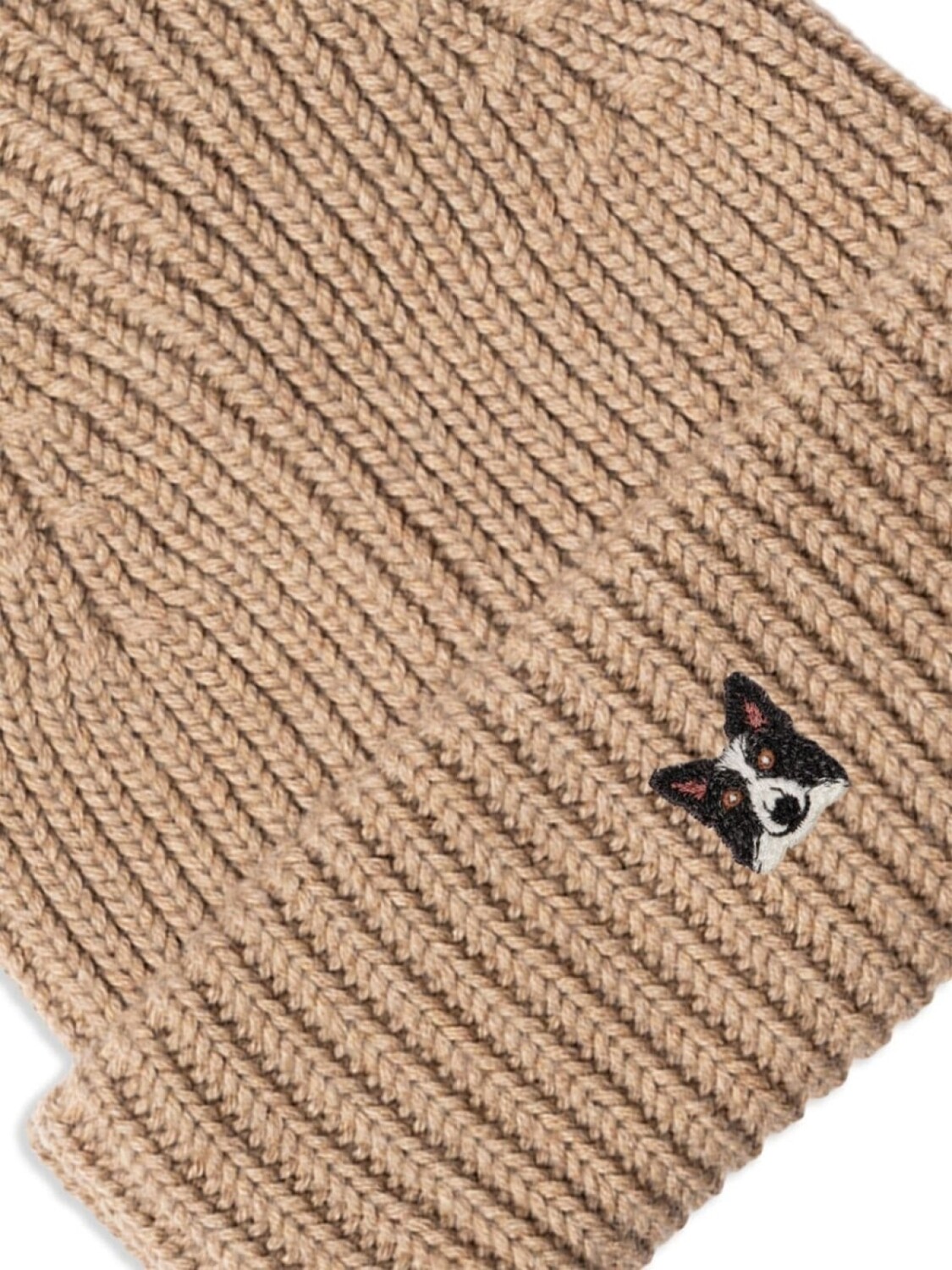 Бежевая мериносовая шерсть, ребристая вязка, вышитый мотив собаки, отворот, круглая тулья, без застежек