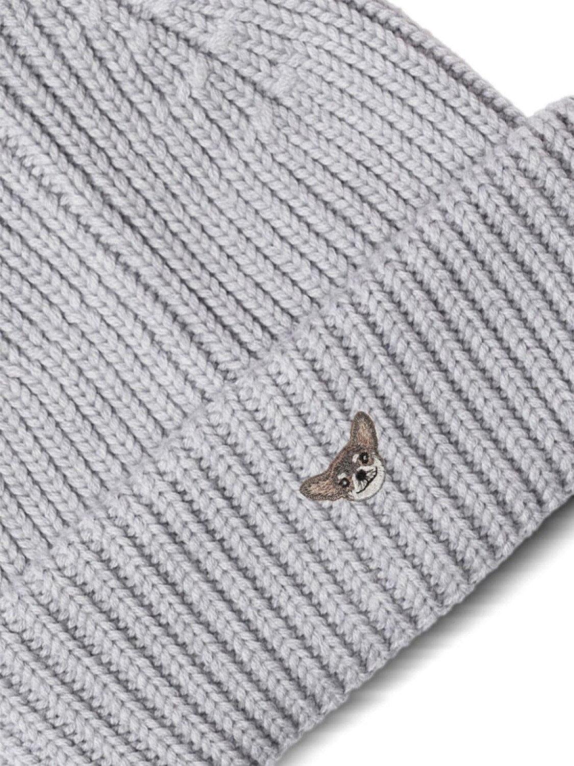 Серая мериносовая шерсть, ребристая вязка, вышитый мотив собаки, отворот, круглая тулья, без застежек