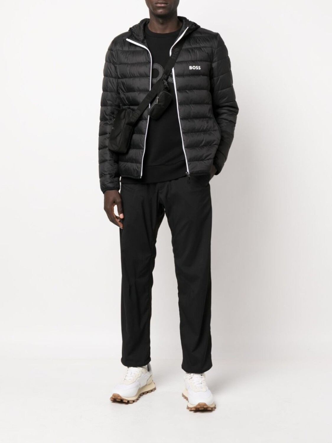 Принт с логотипом на груди, классический капюшон, застежка на молнии спереди, длинные рукава, эластичные манжеты, два прорезных кармана по бокам и прямой подол. Цвет: черный.
