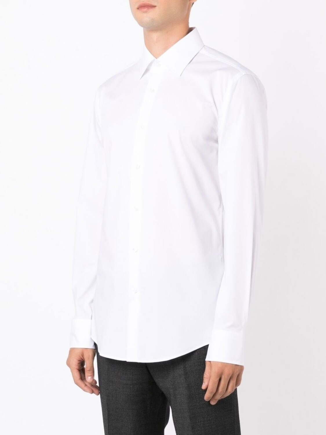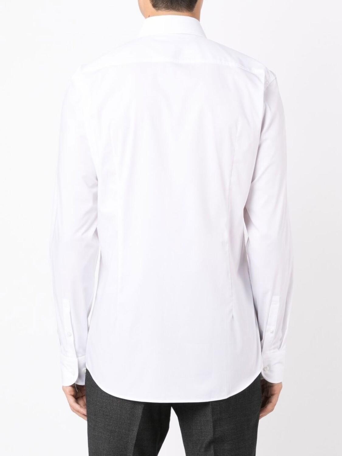 Белый, хлопок, узкий крой, плоский заостренный воротник, застежка на пуговицах спереди, длинные рукава, манжеты на пуговицах и закругленный подол.