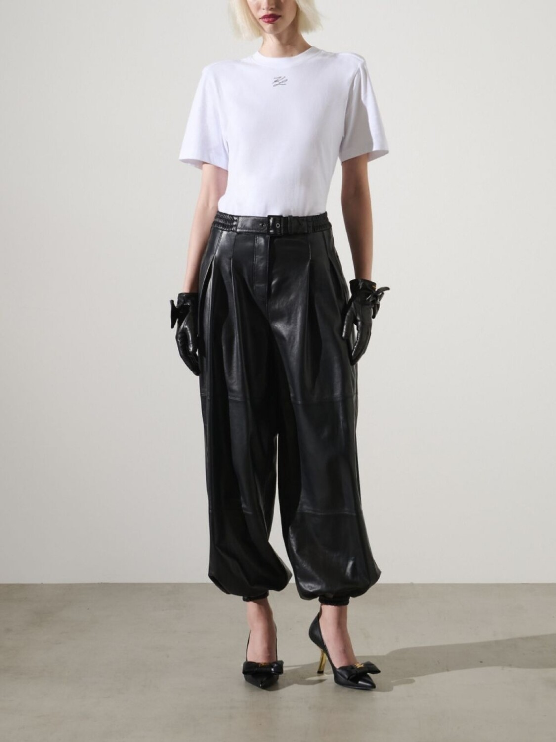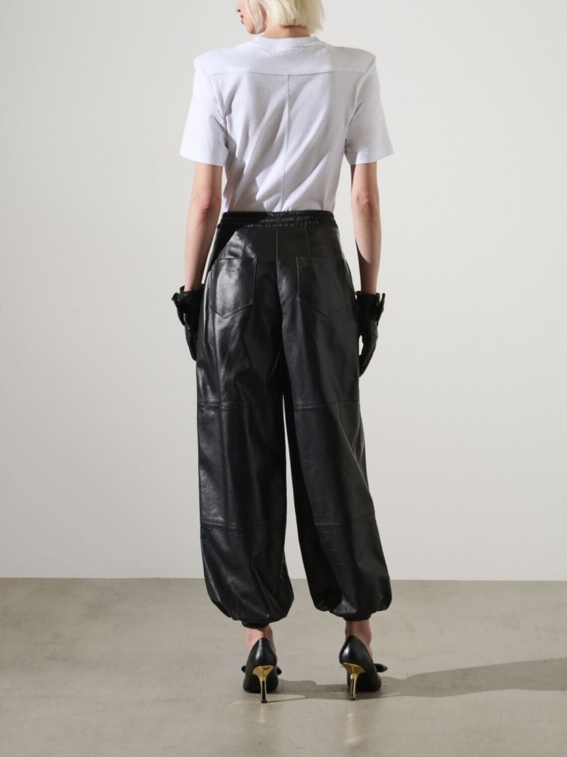 Подробнее о товаре: • черный • овечья кожа • гладкая текстура кожи • глянцевый финиш • завышенная талия • ширинка на молнии • ремень на талии • эластичный пояс • складки • два прорезных кармана по бокам • два накладных кармана сзади • эластичные манжеты • Кожа в составе этого товара сделана на фабрике, сертифицированной организациями Leather Working Group (LWG) или ICEC. Это гарантирует, что производитель минимизировал негативное влияние материала на окружающую среду.
