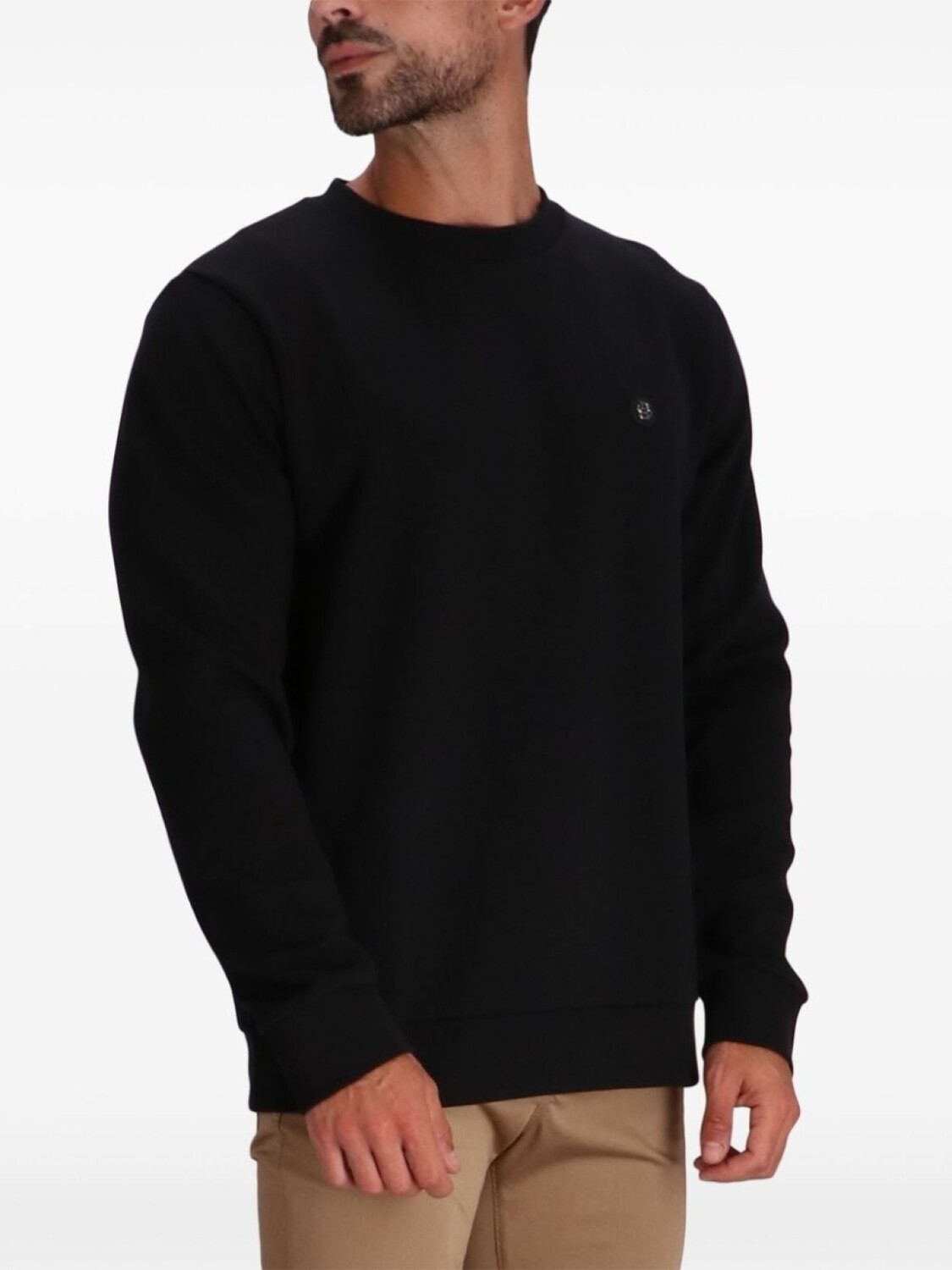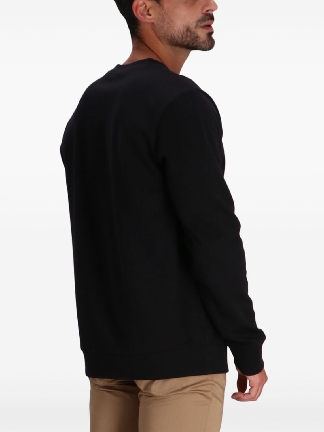 Черная хлопковая смесь, логотип на груди, круглый вырез горловины, длинные рукава, ребристые манжеты и подол, прямой подол
