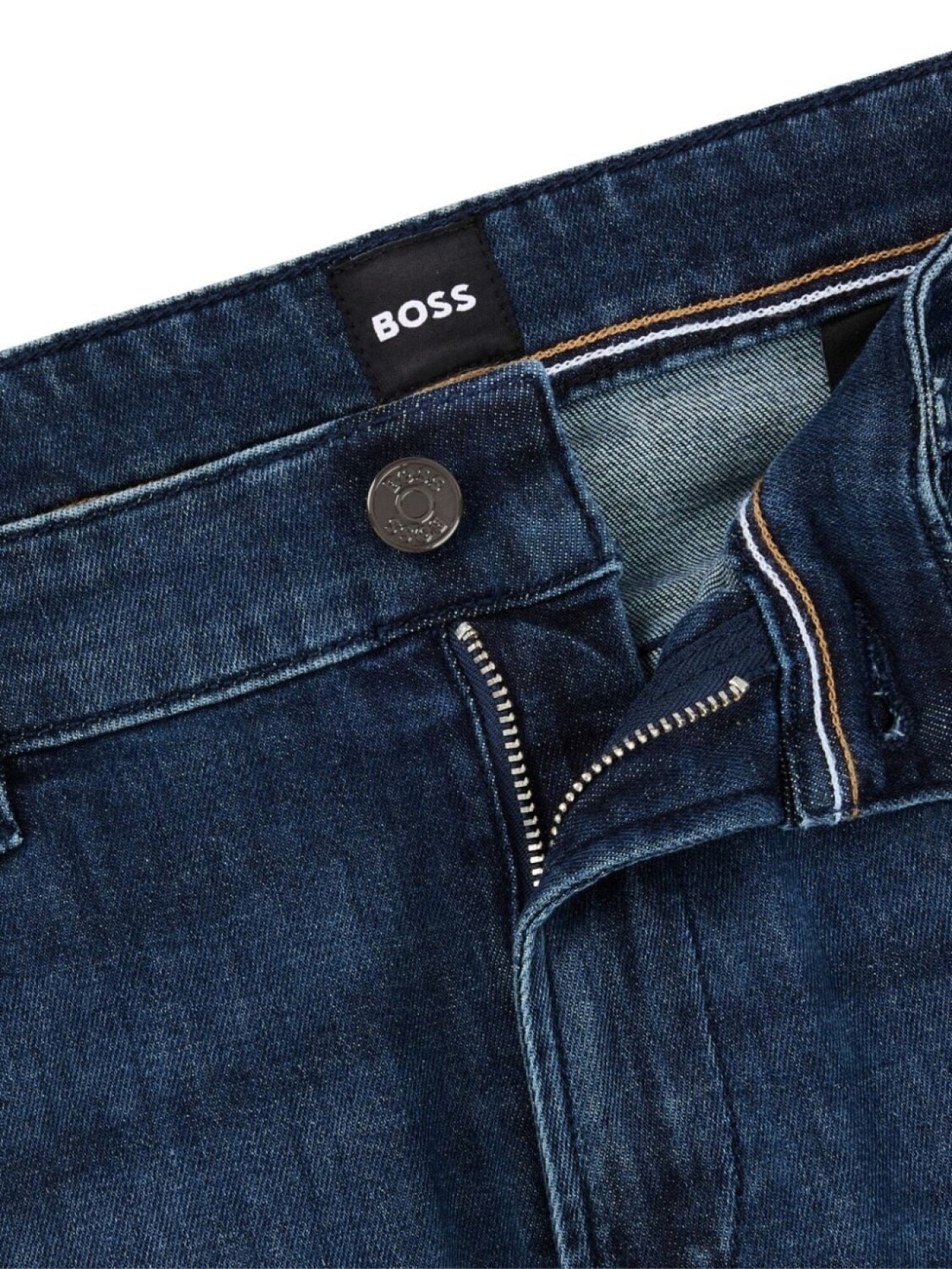 Синий, эластичный хлопок, деним, петли для ремня, потайная застежка на молнии и пуговицах, классическая пятикарманная модель, декоративные складки на бедрах, нашивка с логотипом сзади, узкий крой