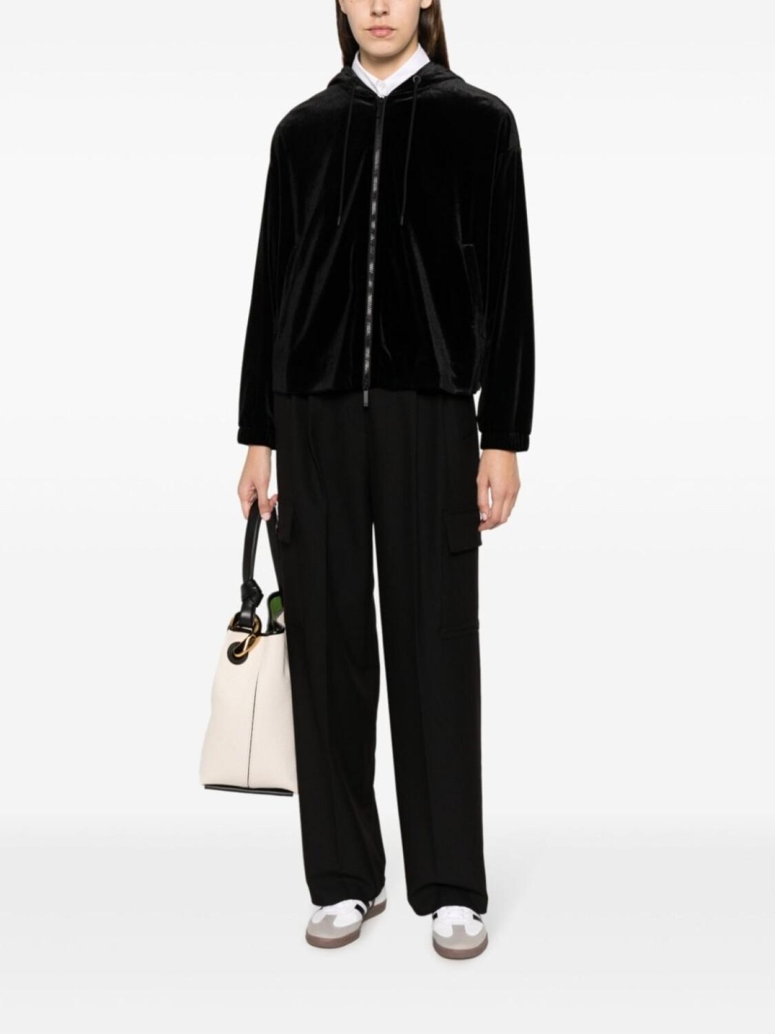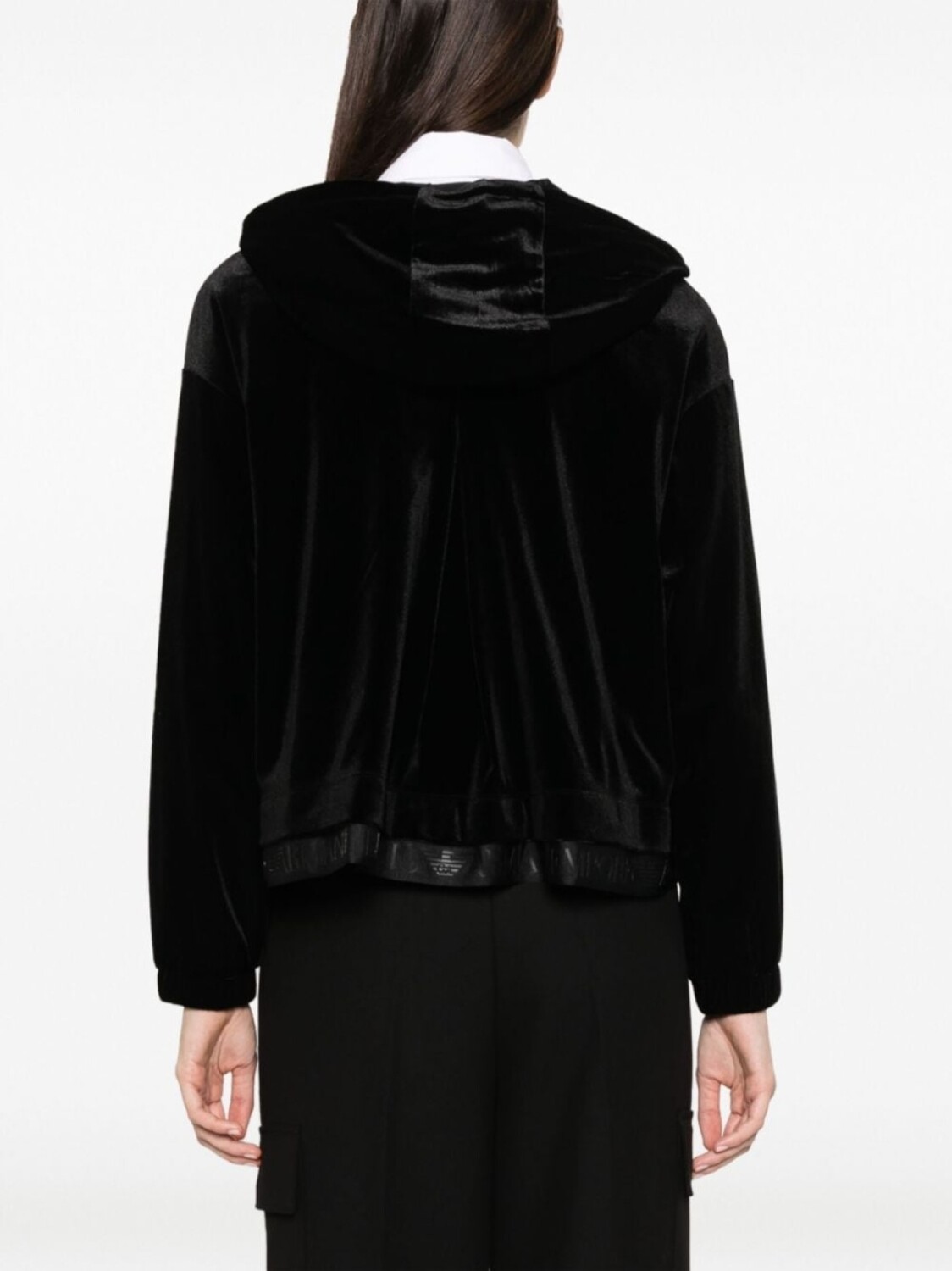 Черный, материал с шениловой текстурой, затягивающийся на шнурок капюшон, двусторонняя молния спереди, длинные рукава, два вшитых кармана по бокам и прямой подол.
