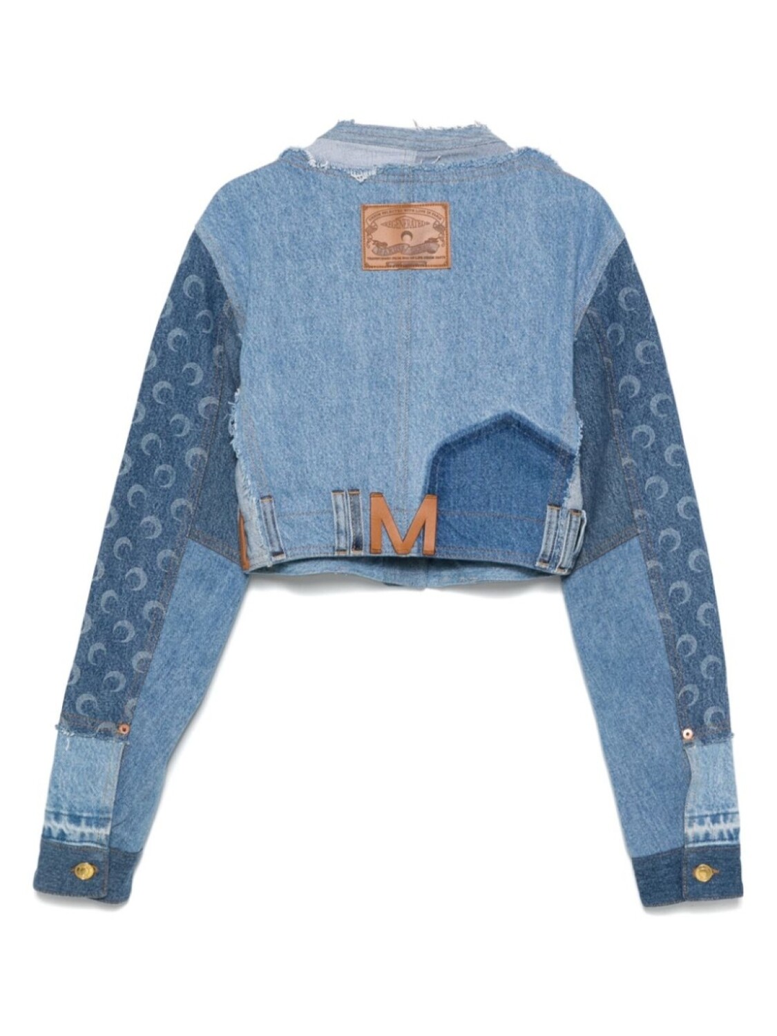 Подробнее о товаре: • голубой • хлопок • деним • техника пэчворк • застежка на пуговицах спереди • контрастная строчка • без воротника • длинные рукава • манжеты на пуговицах • принт с изображением полумесяца • дутые вставки Crescent Moon • необработанные края • петли для ремня на поясе • нашивка с логотипом сзади • логотип сзади • модель без подкладки • прямой подол • укороченная длина