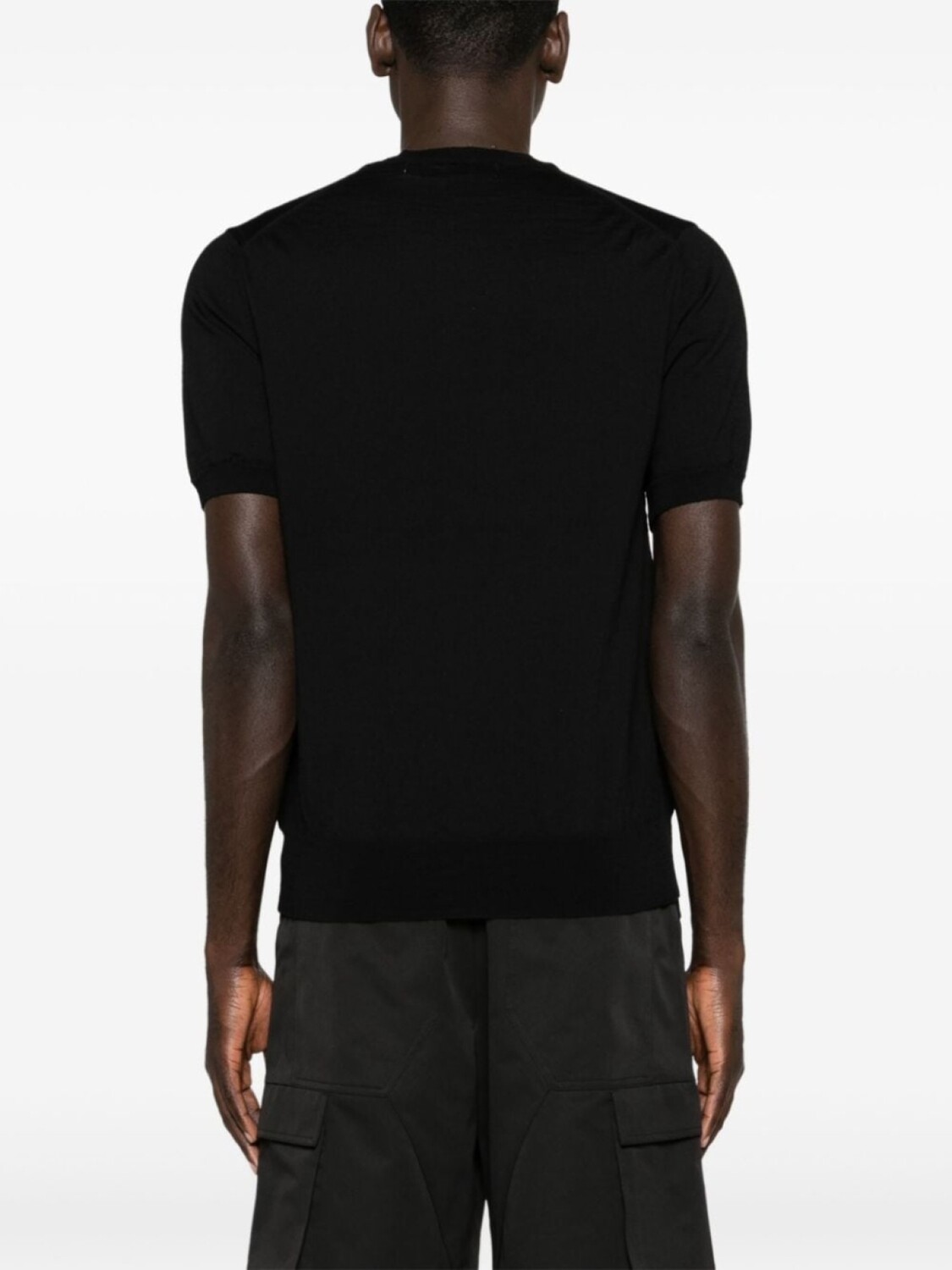 Черный, шерсть, тонкая вязка, нашивка с логотипом в форме сердца, V-образный вырез в рубчик, короткие рукава, подол и манжеты в рубчик, прямой подол, Это унисекс-модель. Обратите внимание, что для нее используется мужская размерная сетка.