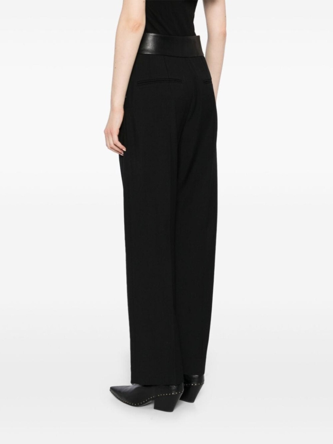 Черная шерстяная смесь, рельефный шов, пояс из контрастной ткани, застежка-молния с двух сторон, серебристая фурнитура, два прорезных кармана по бокам, два прорезных кармана сзади