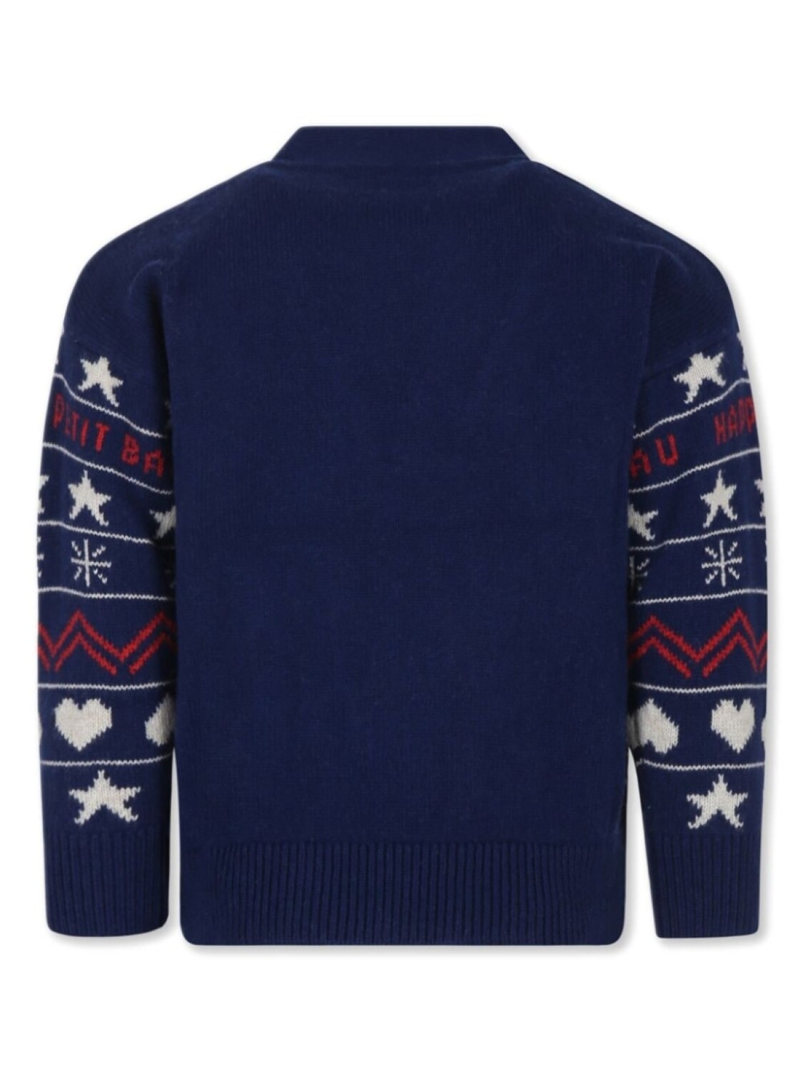 Красный/белый/синий шерстяной трикотаж в рубчик, застежка на пуговицы спереди, узорчатый жаккард, V-образный вырез, длинные рукава, ребристые манжеты и подол, внутренняя нашивка с логотипом
