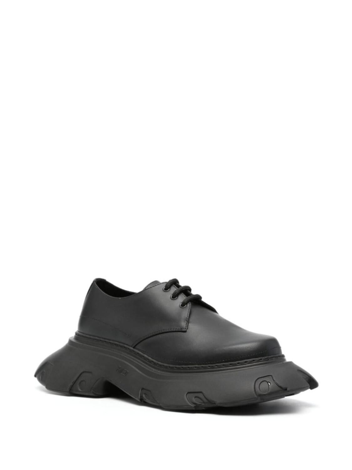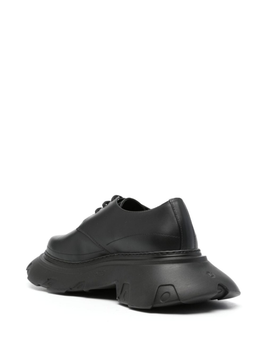 Черная телячья кожа, увеличенная резиновая подошва, шнуровка спереди, круглый носок, фирменная стелька, плоская подошва