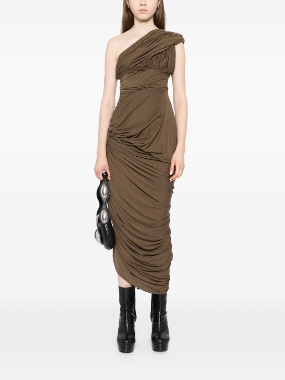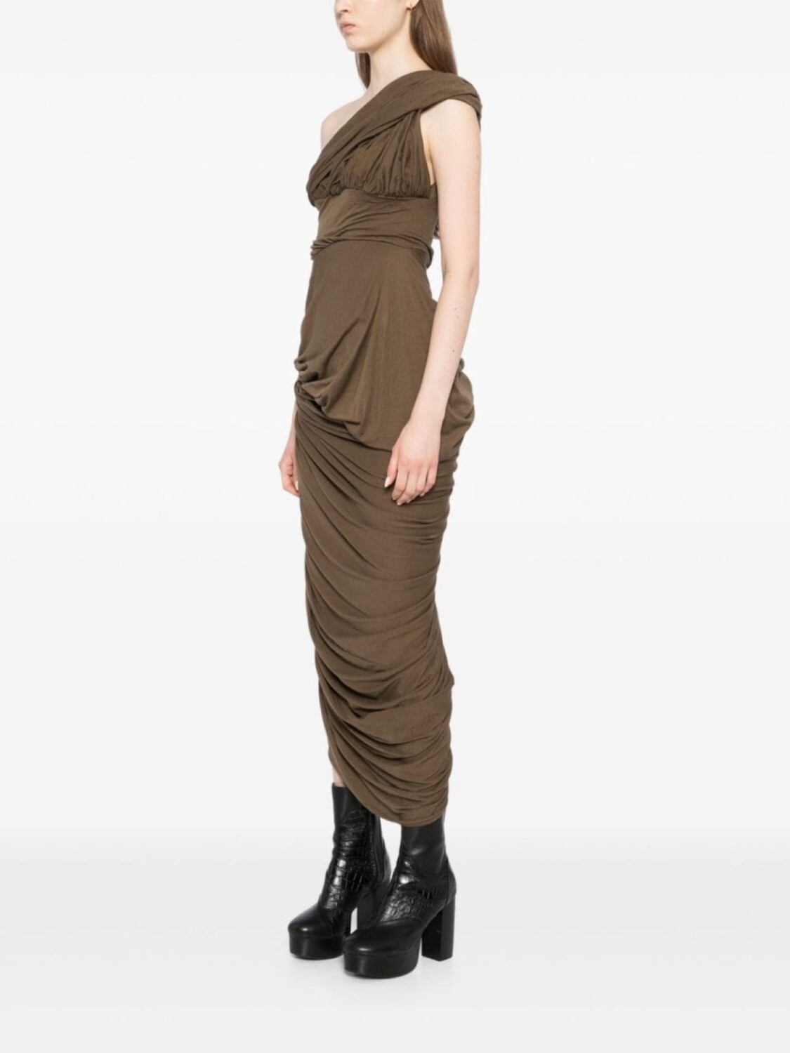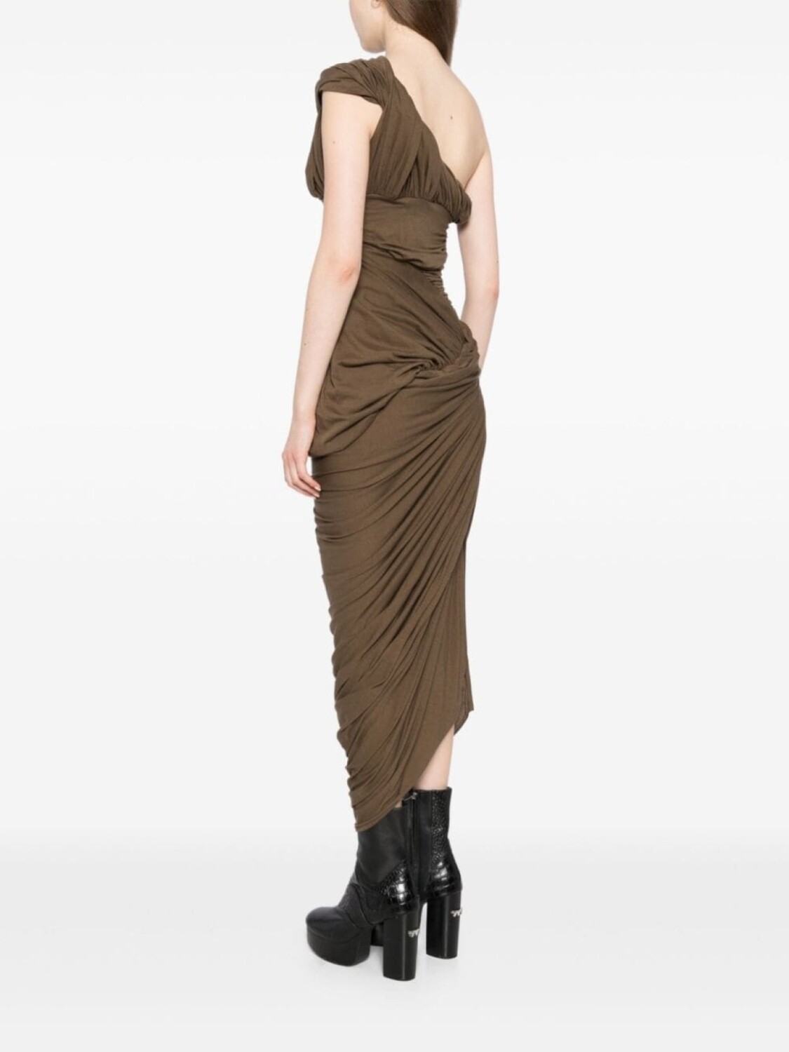Коричневый, смесь органического хлопка и кашемира, ткань джерси, окрашивание готовой вещи по технологии garment dye, застежка на крючках и молнии сбоку, серебристая фурнитура, драпировка, детали с оборками, асимметричный вырез, модель на одно плечо, без рукавов, боковой разрез до бедра, Этот товар как минимум на 50% состоит из органических материалов., Узнать больше о том, какие товары получают отметку «Ответственный выбор», можно здесь.