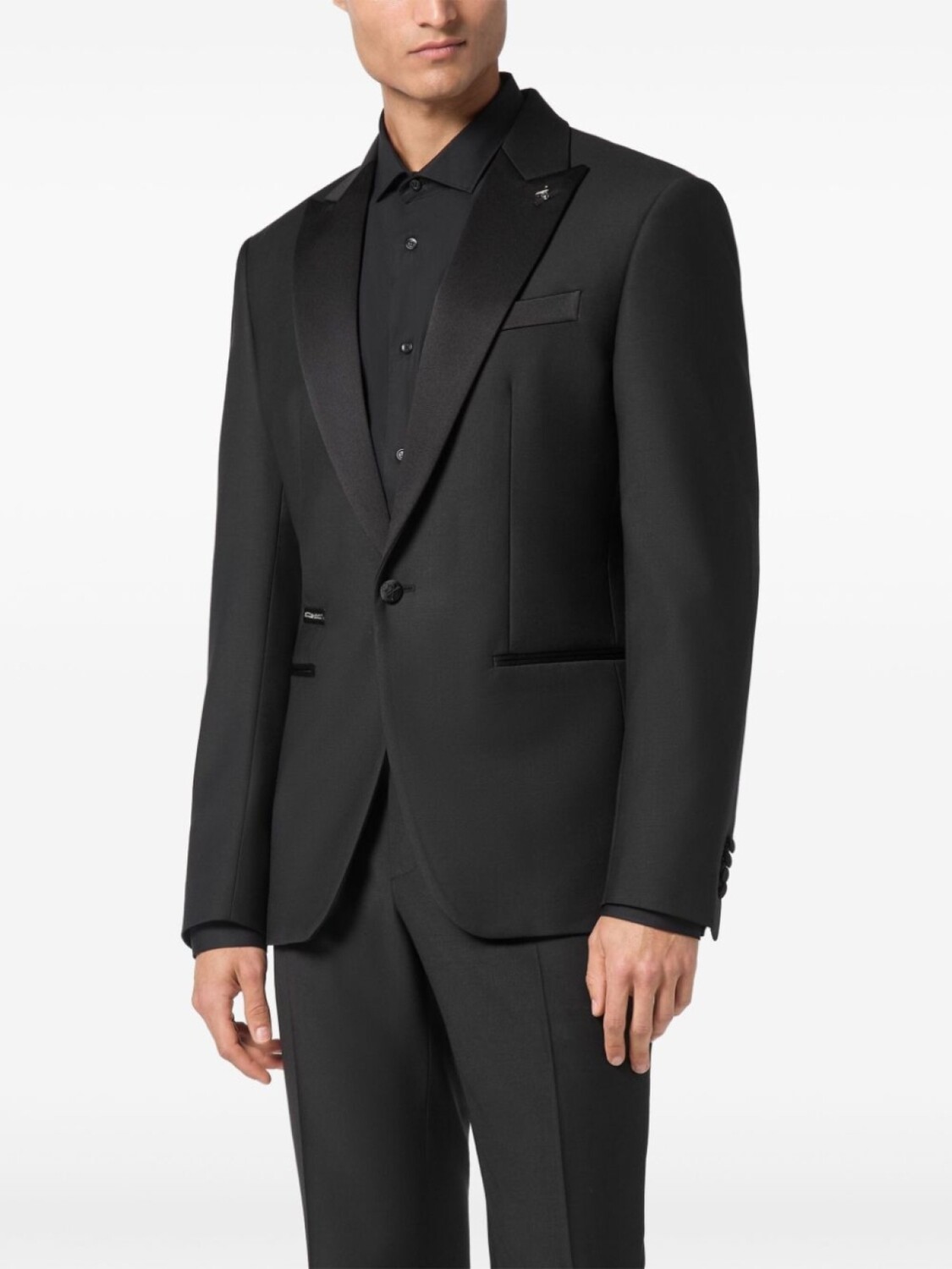 Подробнее о товаре: • черный • принт с изображением черепа на тыльной стороне • застежка на пуговицах спереди • заостренные лацканы • декоративная брошь • длинные рукава • нагрудный прорезной карман • пуговицы с тисненым логотипом • логотип-аппликация • два передних кармана с листочкой • манжеты на пуговицах • декор из стеклянных кристаллов • цельная подкладка • прямой подол