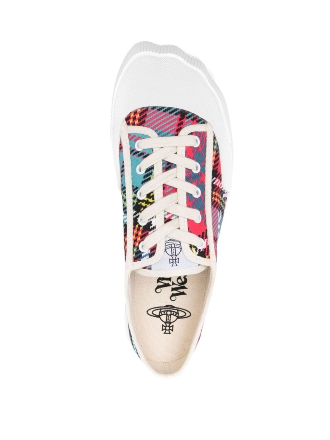 Разноцветный, логотип сбоку, клетчатый узор, закругленный носок, шнуровка спереди, стелька с логотипом и резиновая подошва.