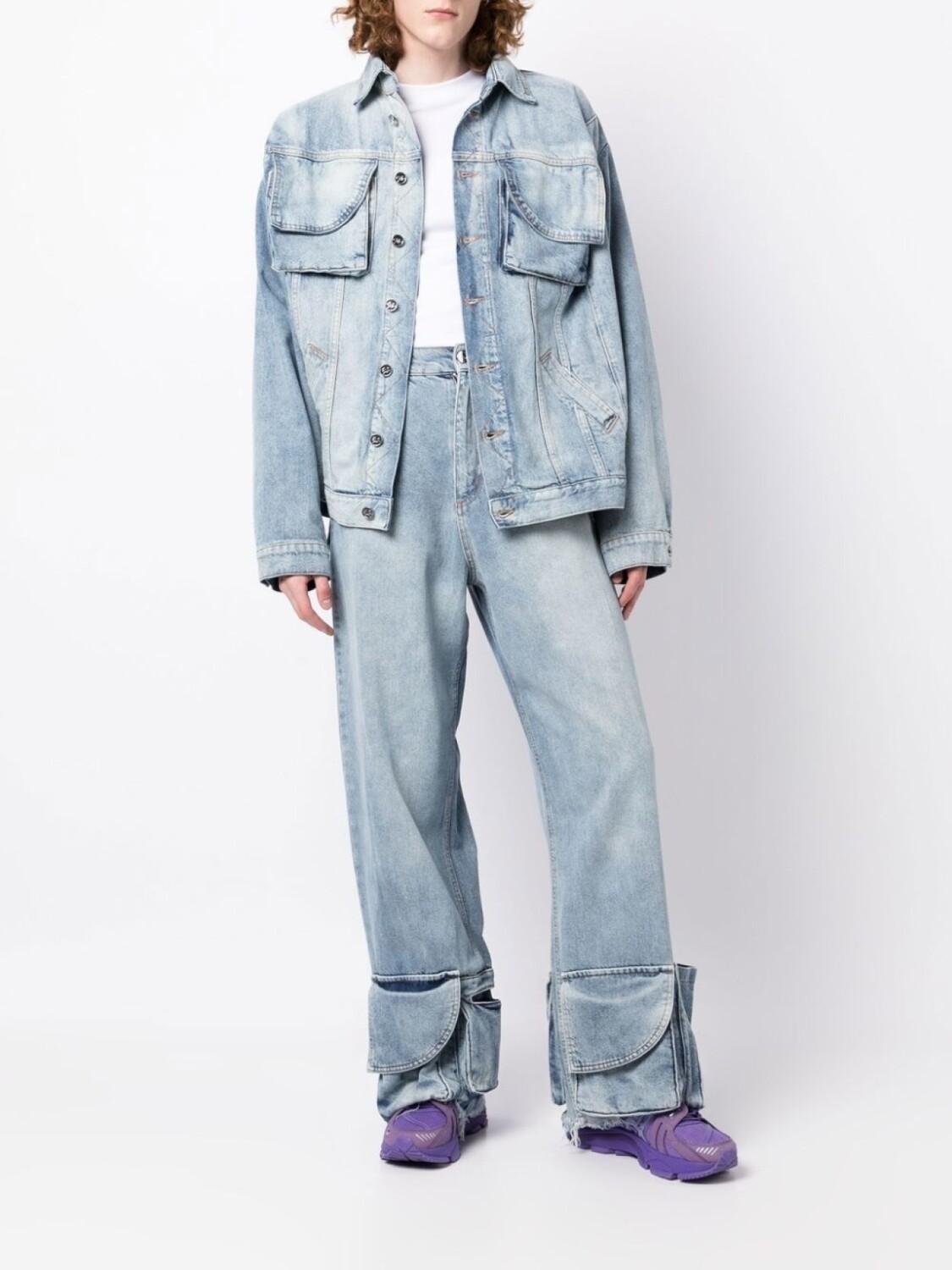 Голубой, хлопок, обработанный деним, нашивка с логотипом сзади, петли для ремня, потайная застежка на молнии и пуговицах, два кармана по бокам, два накладных кармана сзади и несколько накладных карманов.
